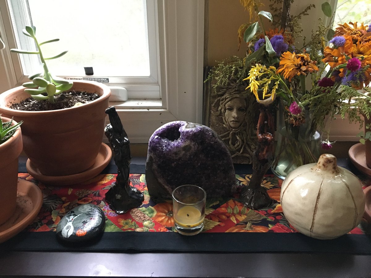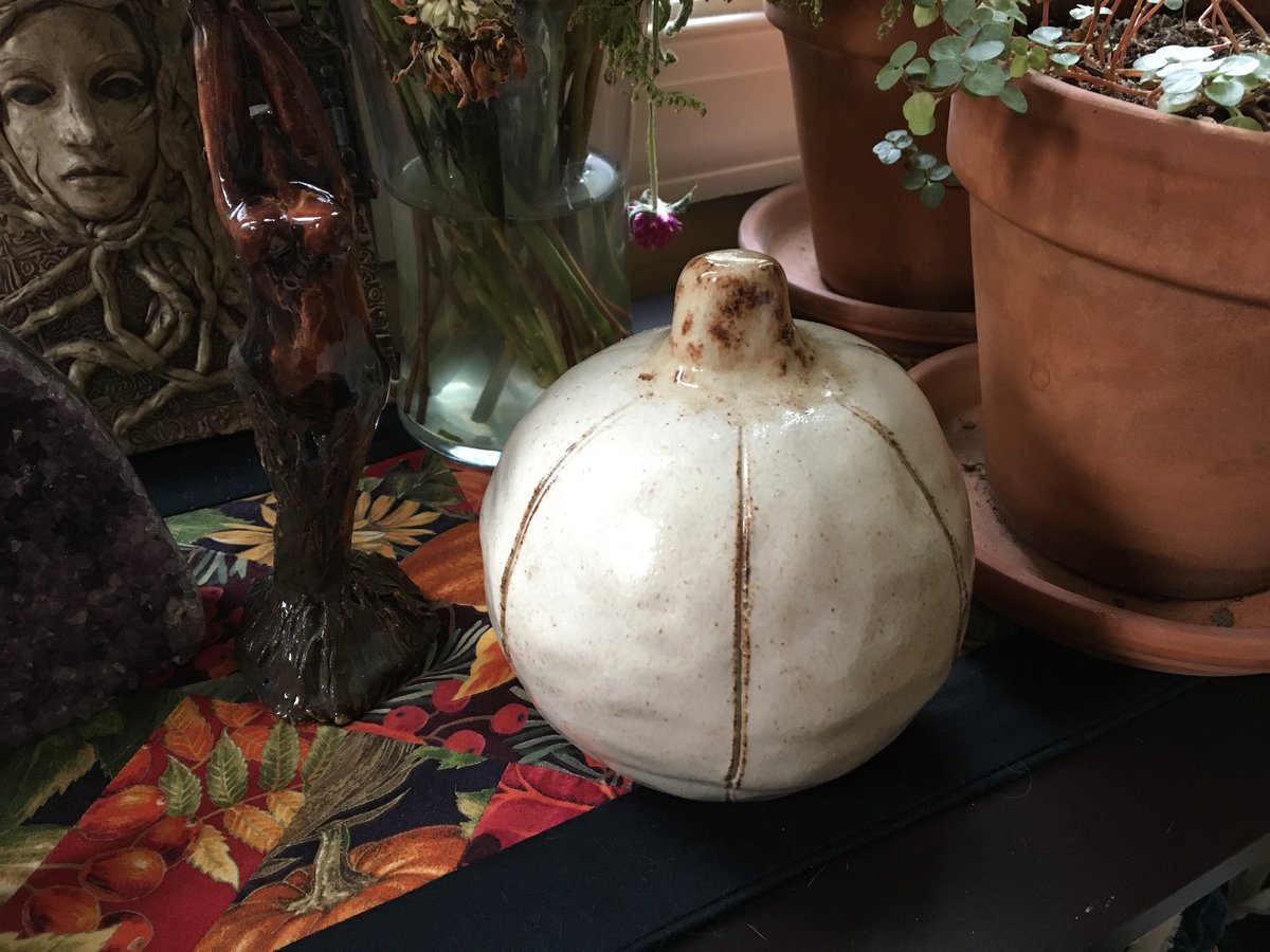 RavenOfSummer Posted October 12, 2019 Posted October 12, 2019 Finally did some work on my altars for autumn and Samhain! I intend for this to be my Samhain altar- will be adding some items to remind me of loved ones who has passed, as well as more candles. I made this pumpkin in my pottery class, with putting it on my altar in mind 😊 I love this little painted Samhain rock, which I got from an artist on Etsy. My other altar I made in a more autumn/harvest theme. The rowan berries around the chalice I collected in Ireland. The chalice is another pottery class piece.