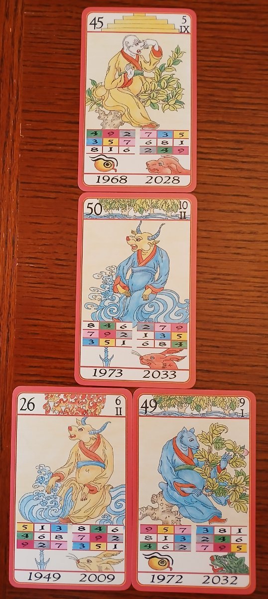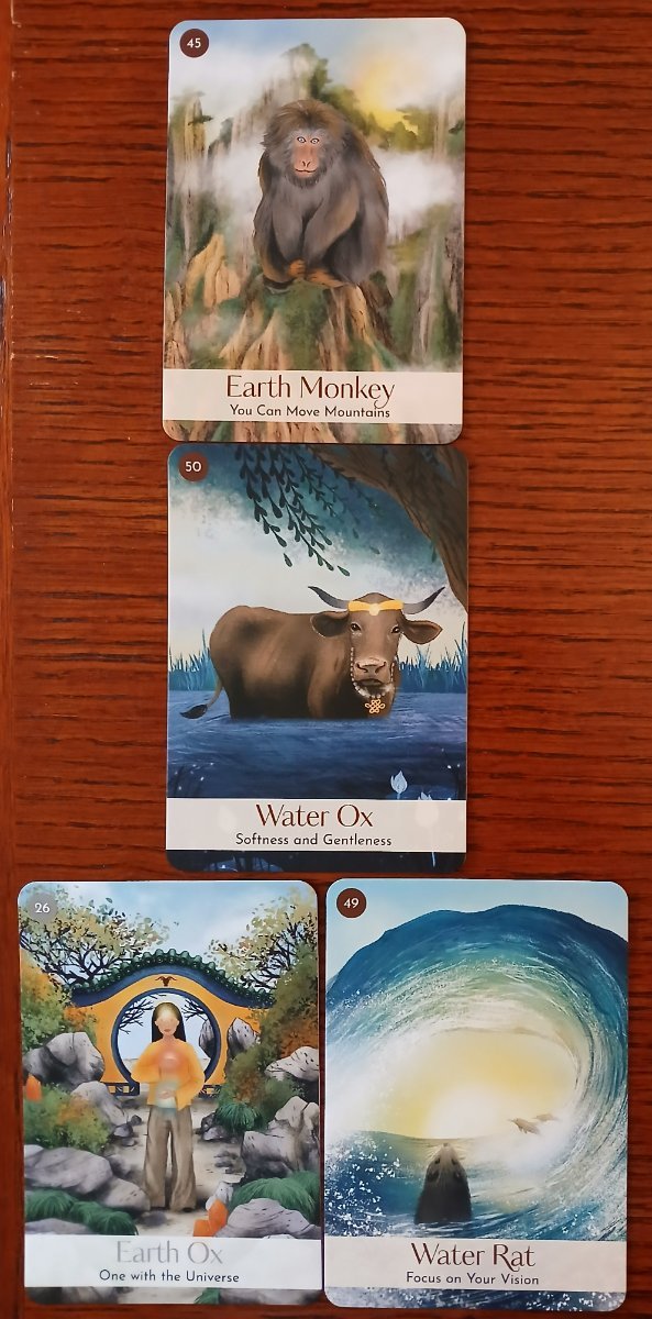 Rachelcat Posted May 12, 2025 Posted May 12, 2025 Hi, everybody! Happy to be here again! I’m thinking this week will be a challenge, but I’m ready to try! I’ll be delving into Chinese animal astrology with Tibetan Oracle Pack and Chinese Five Elements Oracle. I’ve had the Tibetan Oracle Pack by Stephen Skinner for many years and tried to figure it out, but, even though it makes sense at first, it becomes too complicated very quickly. The art is based on a 17th century Tibetan manuscript, but the concepts are contemporary feng shui, which has roots in the Tang dynasty (618-906 CE). The cards have color and other image symbolism and include birth years and feng shui flying stars (number squares). You can see how I get lost! Chinese Five Elements Oracle, by feng shui consultant Vicki Iskandar (Hay House), seems a bit simpler (we’ll see about that!) with realistic-to-cute animal illustrations and key phrases. The basic concept is a combination of 5 elements (wood, fire, earth, metal, water) with 12 animals (rat, ox, tiger, rabbit, dragon, snake, horse, sheep, monkey, bird, dog, pig) for a set of 60 “pillars,” that is, personality types, and cards. You can calculate the pillars for your birth year, month, day, and hour. This is often used to figure out romantic/marriage compatibility and an individual’s lucky directions, locations, and time periods, among other things. I think the best way to do this week is to use the corresponding cards together. And I’ll start slow and see how far I get. (Complicated by the fact that today is full moon reading day, and rule 1 in the guidebook is avoid new and full moons because they’re all yin and all yang. But I’ll live dangerously, I guess.) Wish me luck! Short interview in the spirit of starting slow: What is your strength? Water Rat, Focus on Your Vision The deck helps me see what can be, not just what is. Your weakness? Earth Ox, One with the Universe It’s a little too earthy or down to earth. And there’s not ox here? Only a sigil of one on the wall. What can I learn from you? Water Ox, Softness and Gentleness But oxen are obviously important because here are two. I’m not really a soft and gentle person, just quiet and antisocial. So this is probably a good thing for me to learn. Booklet says water ox is associated with late winter, the most yin time of year. What will be the outcome of our work together? Earth Monkey, You Can Move Mountains Earth is the mountain, monkey is the determined warrior. I will learn this method of divination if it’s the last thing I do! Well, we’ll see!