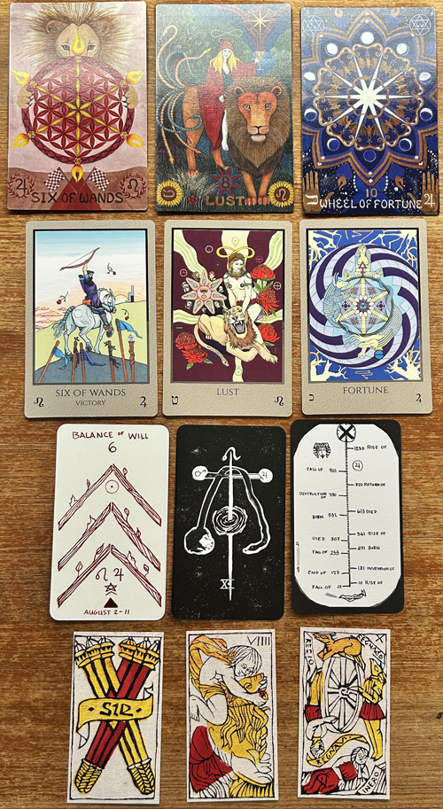 Rose Lalonde Posted August 3 Posted August 3 (edited) The second decan of Leo, a decan ruled by Jupiter. Part 1 is up at Tabula Mundi DECAN WALK: LEO 2, SIX OF WANDS – Part I Excerpt: The planets dignified here are rulers and leaders. The Sun, center of the entire planetary system, largest body, source of light and life and our star, is and has always been associated with sovereigns and commanders. Jupiter is the largest orbiting body, and is associated with Zeus, king of the Olympian gods. This is a straightforward image, of a triumphant leader on horseback, dressed in imperial purple, crowned with myrtle, raising his bow triumphantly. He is at the top of a hill, and rising towards the Sun. He looks back at his followers, who raise their staffs and banners to him, honoring him by throwing roses in the air. There is no ambiguity at all: this is victory being celebrated, and a time to shine. Part 2 Telos Tarot of 777 6 of Wands Strength/Lust for Leo Wheel of Fortune/Fortune for Jupiter Prince/Knight of Wands (Last decan of Cancer, first two decans of Leo) The Sun for the sun (all of the Sixes) Edited August 13 by Rose Lalonde