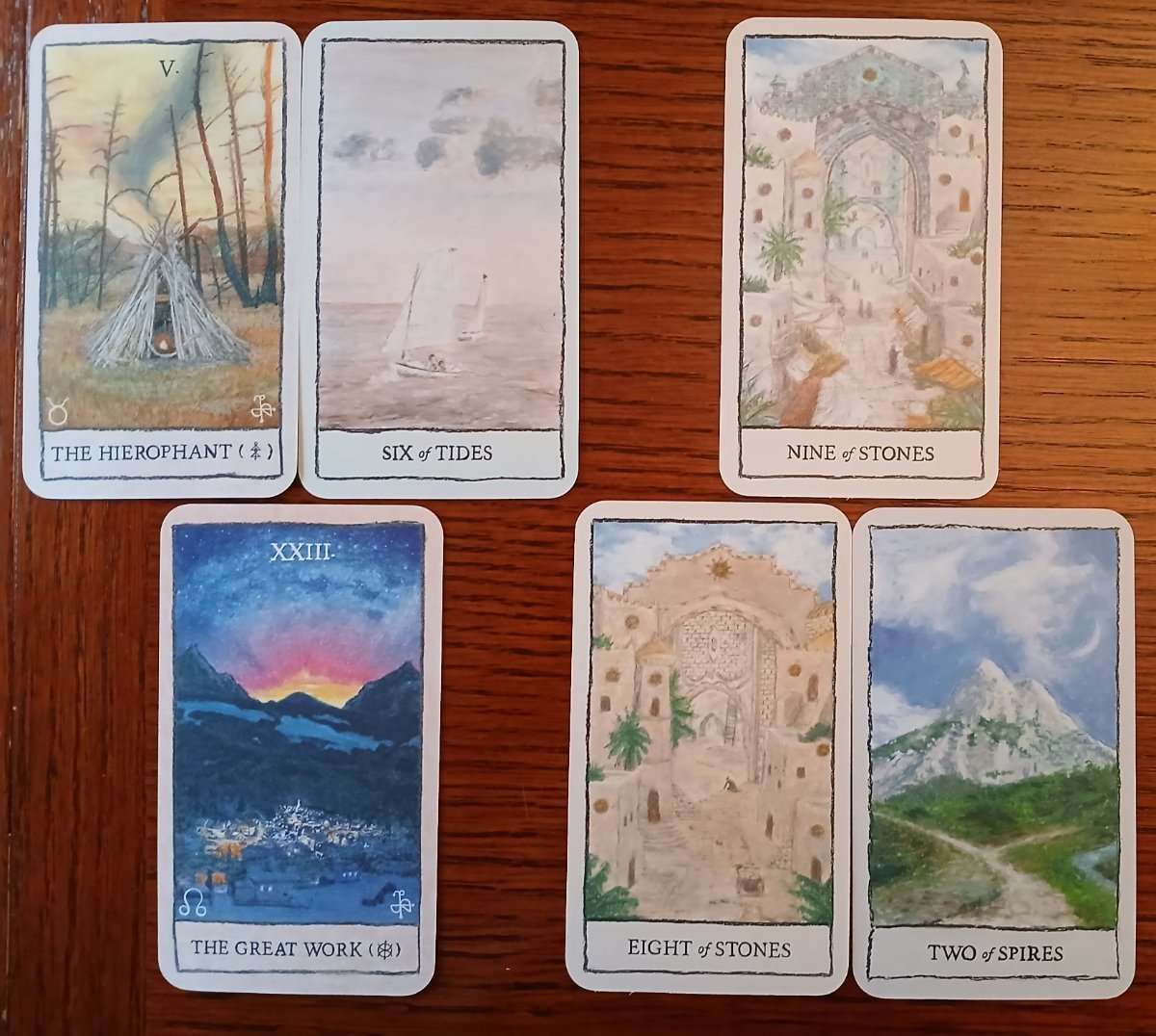 Rachelcat Posted August 18, 2025 Posted August 18, 2025 Hi! I'm here finally! Don't you hate it when work gets in the way of tarot?! This week will be Mindscapes Tarot, a new offering from Hay House, continuing my landscapes deck acquisition streak. There are a few people and animals, but it’s mostly empty landscapes, with and without human artifacts, painted in pastels. The majors have astro attributions and an artist-designed glyph. There are two extra majors, The Catacomb and The Great Work. The suits are Branches, Tides, Spires, and Stones. (Spires are mountains, not human-built towers.) The suit cards make an attempt to show the same scene over time, most obviously in the Stones suit. The booklet provides “actions” for the majors, affirmations for the courts, and journal prompts for the suit cards, along with two custom spreads. Let’s see what the deck can do! Interview time. What is your most important characteristic? The Great Work (extra major) It truly is a magical or alchemical deck. It takes itself seriously. What is your strength? Six of Tides The deck can take me places. Your weakness? The Hierophant It’s not very traditional, which is its goal. It thinks tradition is old-fashioned and limiting. (And smoky.) What can you teach me? Two of Spires It can teach me to make my own decisions of which way I want to go. Even if both options seem very similar. How can I learn it? Eight of Stones By working at it and putting my mind to it. What will be the outcome of our work together? Nine of Stones I will feel like the deck is a beautiful addition to my collection of art.
