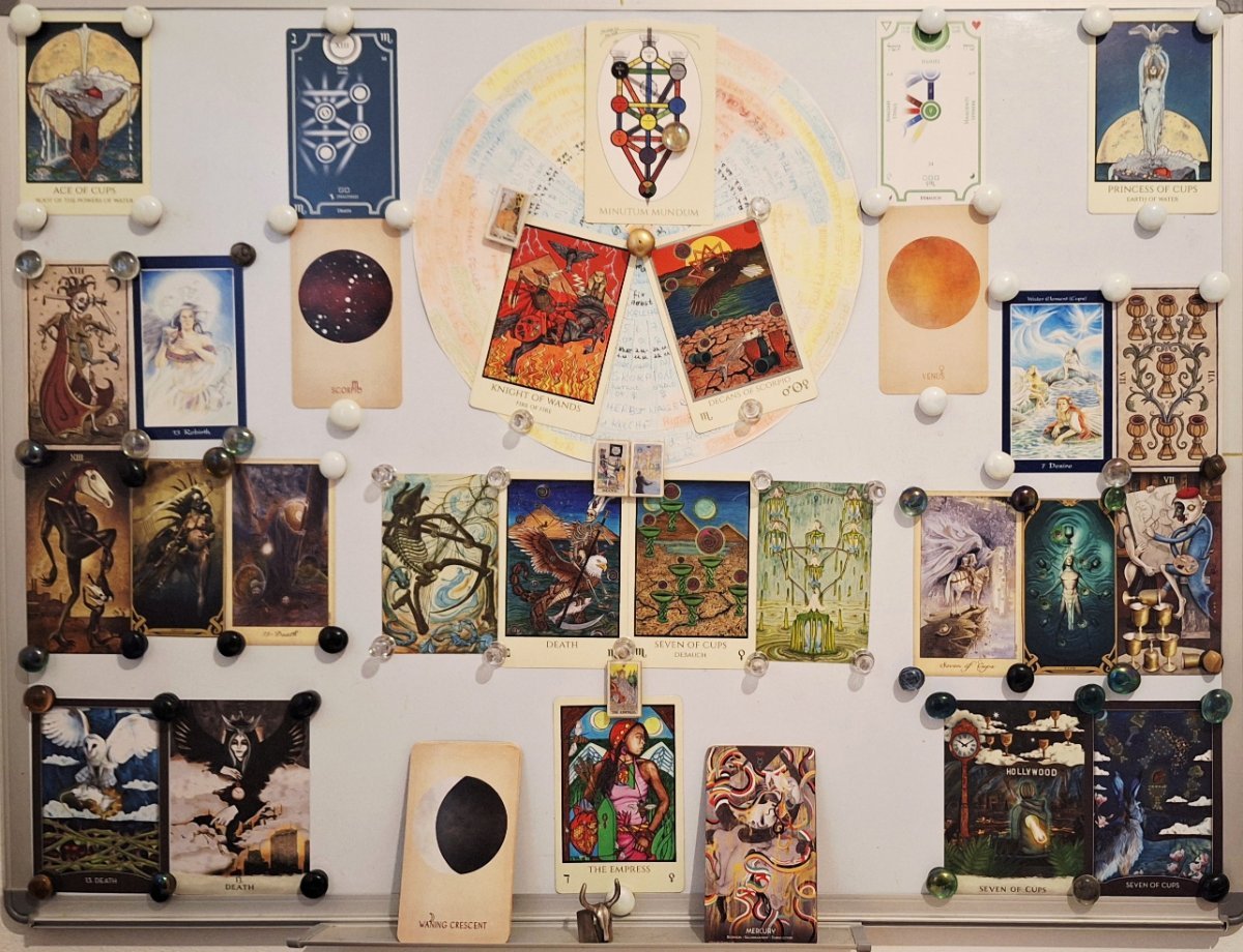 Nemia Posted Friday at 05:22 AM Posted Friday at 05:22 AM That's my tarot calendar right now (only the day of the week has moved on - from Wednesday to Friday). To the left: Death cards, to the right: Seven of Cups. Centre bottom: the planetary ruler of this decan, the Empress. We're in Netzach, the sephirah associated with Venus, so it's a double Venus. Since Scorpio is a Water element, it's Netzach in Briah, and all these "feminine" aspects weaken each other. In the RWS Seven of Cups, you're weakened by indecision, illusions and unrealistic expectations. In the Thoth Seven of Cups, it's even worse: nothing healthy can grow and develop right now, you're drowning in a swamp where hope turns to despair and listlessness. Some Venus cards reflect the positive potential of the planet: the loving Two of Cups, the well-balanced Four of Wands. But here, it's a negative side of Venus influence. The middle decans (fixed signs) are an interesting constellation. Gvura/Mars/Five pulls to one side, Netzach/Venus/Seven to the other. Only Tif'eret in the middle (the Sixes) is completely positive and radiates its optimistic light. However, Sevens, like all odd numbers, are dynamic, and the Seven is also associated with the basic rhythm of seven planets, seven weekdays and seven virtues. So whatever is going on right now, it's not going to stay that way. You move through that swamp, and some of your pipe dreams have the potential to turn into real, achievable goals. The Knight of Wands tells us that Sagittarius, the mutable Fire and last sign of Autumn, are knocking on the door already. Another sign that change is imminent and soon, the swamp is behind us, and we see clearer.