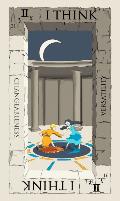 Guest Posted April 16, 2018 Posted April 16, 2018 i sorta changed directions with the courts, so many views of this thread without a comment, is more telling than a hundred posts, thank you. :) i have stripped down the court cards even further. The court cards are in general describing these rulership's by a given zodiac, so I went with just doing the twelve zodiac cards for the courts. i am quite happy with the concept, I approve of anything that make s the deck less complicated and more straight forward.\\ Here is gemini, I have been going back and forth with it a bit. do they dance out side? in space? in this tower? meh... Gemini is the third zodiac and it would correspond to a king card of either swords or coins depending on your deck. I think of it as king of Air personally. edit - i updated the image a little cause I was bored...