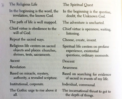Whisper Posted February 27, 2018 Author Posted February 27, 2018 The way I see it is that there might be spirituality in religion, but there doesn't have to be religion in spirituality. Yes, that's is exactly ! You said it very clearly in such few words, when I have always so much trouble trying to explain ! :) The comparison I mentioned isn't in a book by Dyer, it's in Hymns to an Unknown God by Sam Keen. It stayed with me because Keen's differentiation between what he calls "The Religious Life" and "The Spiritual Quest" gave me food for thought. I've attached it. :) I've gone off track, here. We were talking about an article and now we find ourselves talking about spirituality. ;D Do let me know what you think, though. :D