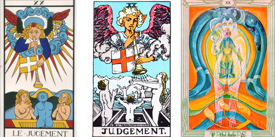 Rose Lalonde Posted April 30, 2018 Posted April 30, 2018 Judgement/ The Aeon Please see the discussion thread if you'd like some background about the study group. As a visual start, here are the Tarot de Marseille Conver, the RWS, and the Thoth. You don't have to compare your deck with these, though, if you have another deck in mind. If you'd like to add an image of the card you're discussing that would be great. If not we can google it. You can write about the same deck someone else did. Feedback on comments about this card are welcome here! For general questions and suggestions, please use the discussion thread.