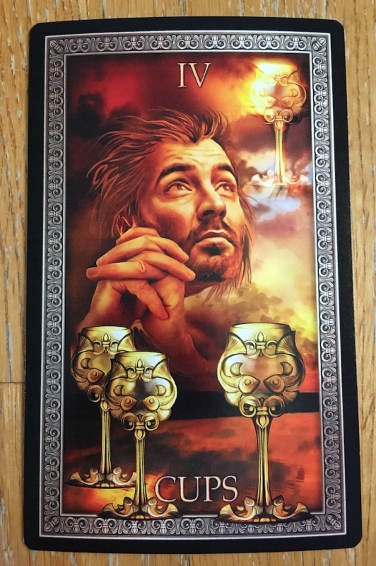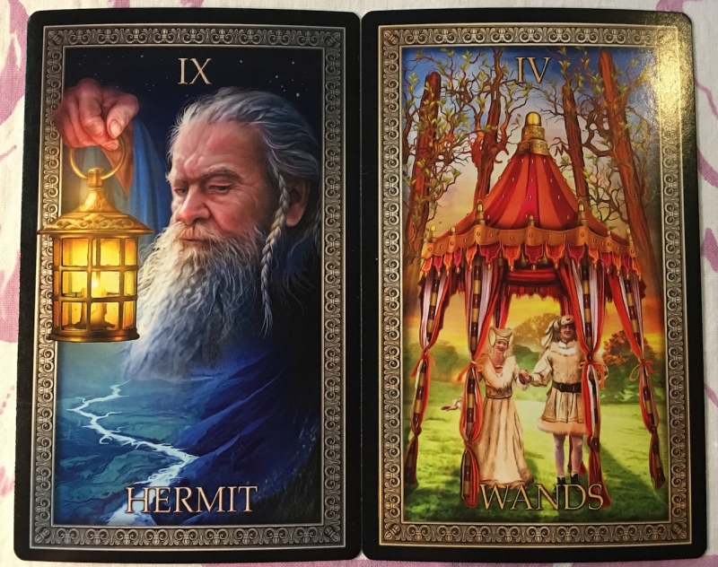 Madame Squee Posted May 26, 2018 Posted May 26, 2018 Re: Tarot Grand Luxe This week I am focusing on observing pairs of cards, in order to get really familiar with my deck. In this exercise, I'm looking for visual elements that relate to one another across the borders. That's enough for this exercise, but if I want to carry it a little farther, I look for meaning in the relationships that I see. Here are a couple of examples: The Devil and 9 of Swords. This connection is obvious: the Devil's visage reappears in the nightmare of the 9 of Swords. My feeling is that this pairing results from the artist's intention rather than serendipity and almost seems heavy-handed. Of course -- it makes sense that the Devil would appear in a nightmare. Nevertheless, it works for me, and it is this pair that started me on this quest. The Hermit and 4 of Wands. Honestly, I almost moved on from this pairing. Then, it jumped out: the shape of the lantern and the shape of the tent match. I find this Hermit unusual: he holds his lamp in front of him, but he appears to be looking behind him. I learned many years ago that the Hermit reveals a warning in the card that he is facing. What warning do I see in the 4 of Wands? Spider legs! Those striped tent poles look like spider legs to me. Now, I don't mind spiders in the least, so what is the warning about? Something alien? Something potentially dangerous that has been disguised as something welcoming? I haven't decided yet. For the rest of the week, I will continue to shuffle my deck twice a day and turn over all the cards, two by two, looking for related elements.