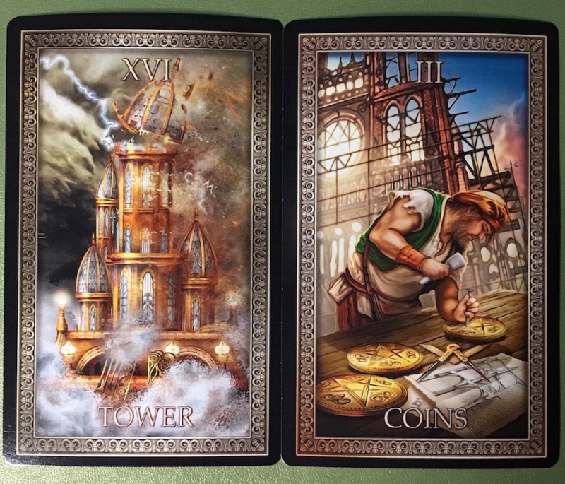 Madame Squee Posted May 30, 2018 Posted May 30, 2018 Thank you for the encouragement, everyone! I'm really hoping that I will be able to stay focused on my cards this week! The Tower and 3 of Coins turned up together today. The visual element that connects the two seems overwhelming this morning, but this is the first time I've noticed the similarity. It appears to me that the Tower is being rebuilt in the 3 of Coins, and I love that message. Then, I flipped them around for a different view... Eek!! Pride goes before destruction?