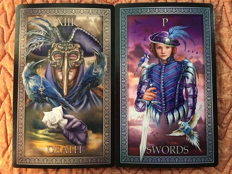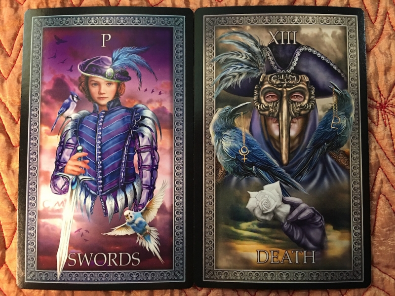 Madame Squee Posted June 1, 2018 Posted June 1, 2018 Death and the Page of Swords caught my attention this morning. It started with the feather in their hats. Then, the birds -- matching, except that the budgie has swooped down from the Page's shoulder to become the white rose in Death. Very tidy, except two major elements don't match: the mask and the sword. I feel like they must be key to my understanding the message. It seems like it should be easy, but I'm not getting it this morning. I switched the cards around for a different view. In my eyes, they are practically mirror images in both positions. I prefer to see the Page of Swords in front of the Death card... "The Picture of Dorian Gray" popped into my mind. ;D I've been switching cards around the past couple of days to study why I prefer them one way or the other. Honestly, I feel like this one is a frightful combination in either direction. Is it the presence of the Death card or the backstabbing Page of Swords, who looks as if butter wouldn't melt in his mouth? :P
