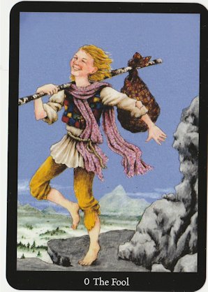 Trogon Posted July 23, 2017 Posted July 23, 2017 Anna K Tarot - The Fool The Anna K Tarot is new for me, so this is the beginning of my study of it! It is RWS based and, as such, has a Fool who is reminiscent of the one we are familiar with. We have a youth who could be a girl or a boy, joyously stepping out on a new journey. We see the bundle containing what is needed for the journey and the mountain peaks and a valley below, in the back ground. We also see that there is danger in the road, though it is not as certain in this card as it is in the RWS deck. Though the Fool walks along a high mountain path with a sharp drop off, we can see it is only a break in the road and they can step past it. I do miss the dog or cat in this image. I've always rather liked some sort of depiction of our lower nature, our instinct either urging us on, or attempting to warn us. Also, The Fool in the Anna K is a little more vagabond-ish in appearance that that of the RWS. In the RWS the garments worn by The Fool appear to be rather expensive and rich-looking. While those in the Anna K Fool are worn, torn and patched which gives the card more of a feel of waywardness. It feels as if this Fool not only has no specific destination, there is also nothing left behind. Whereas The Fool in the RWS may be leaving a great deal behind (and my have to return to, someday).