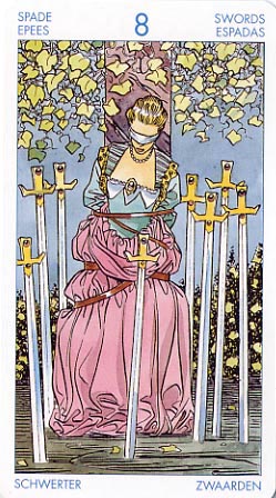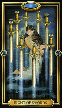 Regarding the 8 of Swords - I've encountered some tales of Bound Ghosts, and some of them are quite horrific. There is a fictional rope-bound spirit who died of strangling in the 13 Ghosts movie that is called The Bound Woman. She is the 3rd denizen of the Black Zodiac, the avatar of the Black Gemini. This is her story:
