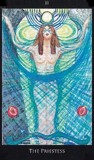 Trogon Posted September 6, 2017 Posted September 6, 2017 I'm falling a little bit behind on this study group! I didn't really want to do that. But, you're not quite rid of me yet! ;D The High Priestess card in the Röhrig Tarot seems, at first, to (perhaps) have fewer symbols than the Thoth or the RWS. But when one looks deeper one can find a lot of symbolism. The criss-crossing lines which we find on Crowley's card appear here as well, though they are finer, more tenuous. Her own hair seems to form the curtain which we can not see past. The light of the upper part of the card contrasts with the depths of space in the lower part. And there is the High Priestess herself, seemingly in a trance, observing what mysteries we know not. You might recall that Rörig's Fool was shown as being both feminine and masculine. In the Magus we saw him realized as the masculine, all physical energy and manifestation. Now, here, in the High Priestess we see the feminine part of The Fool realized. The High Priestess here is the "embodiment of femininity and it's transcendent aspect." ("The Röhrig Tarot Book".) Carl Röhrig goes on to say: "Men and women who are at the stage of the Magus have solved their existential problems in a more or less satisfactory way. When they arrive at the phase of the High Priestess, however, they begin to suspect that another reality, which is beyond this so-called "reality," awaits their discovery. They embark on an inward journey to gaze beneath the veil of the High Priestess, Isis, who will lift her veil and disclose her secret to the genuine seeker." I think that Röhrig has captured that feminine essence extremely well in this card. The Moon crown has been replaced here with the actual celestial body and, along with the field of threads extending from her head and the veil she wears, represent the spiritual aspects of the card very well.