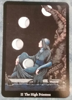 Trogon Posted September 6, 2017 Posted September 6, 2017 The High Priestess for the Anna K Tarot has some different imagery from the Waite's card. For one thing, there are no black / white pillars, no curtain behind which we cannot see. However, there is ancient truth represented by the tree against which she reclines. She watches and understands the changing of the moon and reaches into the the depths of the mind represented by the still pool before her. I find this High Priestess to be more "mysterious" than many others. In large part because she basically ignores the person looking at her. She is immersed in her musings to the point that the "reality" of a person standing there. We come to consult the Oracle, yet she is unaware of the physical presence, she may, or may not hear what we ask ... she may reveal something, or she may not. To me, this heightens her mystique and allure. I also see one other thing of interest. As she watches the Moon ... I realize that it is not exactly showing the typical, monthly phases of the Moon ... but rather appear to be different stages of an eclipse. If we look at the 3rd shadowed one, just before the full Moon is revealed, it is as if a bite has been taken out of the it. This is how the Moon appears during an eclipse ...