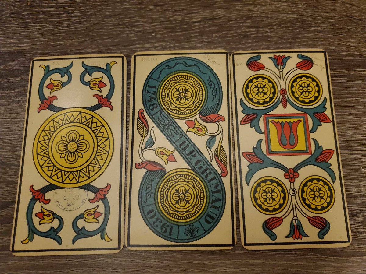 Raggydoll Posted December 29, 2019 Author Posted December 29, 2019 7 minutes ago, bookshop said: Guys guys guys guys i can't believe i'm holding this in my hands, but looooooooook at it Apologies for the sheen, they're under a lamp light and it was hard to block out the glare completely. I might take better pictures in the morning in natural light. I can't believe it, I've spent hours and hours looking at pictures of this deck in all its variants online and I was still completely unprepared for how vivid the colors were in real life.<3 The seller I got this deck from, McClosky's, said they'd dated it to 1931, which makes it one of the oldest Grimaud variants that I know of. It's even got the French tax stamp! I feel extremely extremely lucky to have found a version of this deck that was relatively affordable, and at Christmas, no less. I'm just blown away by it. I honestly spent months and months trying to find this deck variant, in this shade of teal/blue/whatever, and omg it was so so so worth it. I feel like I could take a depth year just to get to know this deck. I could look at it forever. Congratulations!!! This is amazing!! 😍