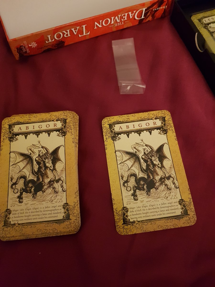Quinn Posted January 21, 2020 Posted January 21, 2020 (edited) So I know this is oracle, not tarot, even though it is the Deamon TAROT.. ..but it happened again. Duplicate card. I'm not happy with the card stock on these, despite what that one review on Amazon says. The card stock is too thick and stiff, the double card I got is already slightly bent. I love the 1863 artwork though, which is more important! Edited January 21, 2020 by Tagi