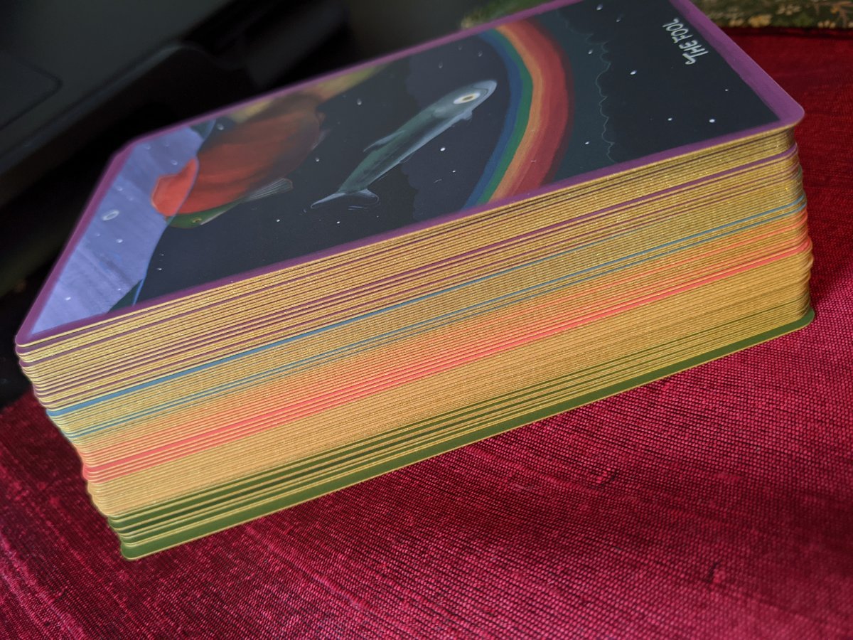 LogicalHue Posted February 7, 2021 Posted February 7, 2021 Forager's Daughter arrived! Comes with a large-ish guide book and in a 2-part box. First thing I notice out of the box: glittery edges! Who wants this?? I like that the borders are different colors for the suits / majors. The book is that kind of magazine-paper, weird binding type book. So the giant full color images are nice, but the feel of the pages and the fact that it doesn't really open aren't great. Very pretty card back!