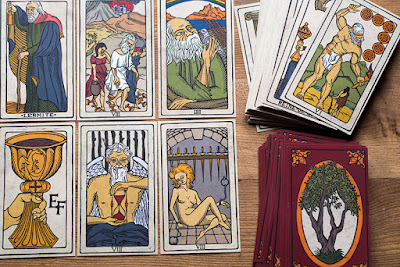 katrinka Posted September 26, 2021 Posted September 26, 2021 On 9/22/2021 at 5:11 PM, gregory said: I have a stack of bags looking for decks ! 🤣🤣🤣 I'm sure you'll remedy that, gregory, You're quite resourceful. As for me, I've been busy with the Rare Triumphs. It's a pip Tarot but with alternate Majors like you see in the Vieville, Minchiate, and others. It sounds a little complex, but it can actually be read quite easily right out of the box - just use what you know already whether that's a little or a lot, and it will speak. 😉 I don't do deck interviews, but I did cut three cards to see what it has to say and I got these: . The 4 of Diamonds shows material stability, and also documents (probably the deck itself as well as things I intend to study). With some practice, this deck will read clearly enough to use for occasional paid readings. But Eternity is a curious card, it shows our little world of time-space surmounted by a peacock (pride) and floating in the heavens which are outside of time. It's reminiscent of The World, but not exactly. I don't think it's completion, I think it's having to do with touching on some deep truths. These cards can be profound. And the final card is a young guy sitting by a crumbling wall and a dead tree. He's strumming a lute and seems perfectly OK with his surroundings. A Sultans of Swing type scenario. (One can only hope that "He's got a daytime job, he's doing alright." 😁 ) Taken all together, while this deck will occasionally make me a little money, it's mainly about insights and inspiration. It's not really a go-to for the moneymaker questions like "Why didn't he text back?", at least not until I'm very familiar with it. But I can spend a lot of happy hours with it, it has a lot to say. I blogged it last night, with more images and lots of links, and I really don't feel like reproducing all that here. So I hope it's OK to post the link, if not, mods please remove. I'm not selling anything of mine in the post, though it does link to Ian's Etsy store. https://fatekeepson.blogspot.com/2021/09/the-rare-triumphs-tarot.html