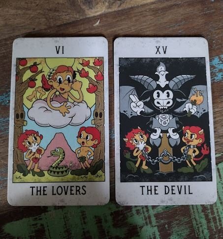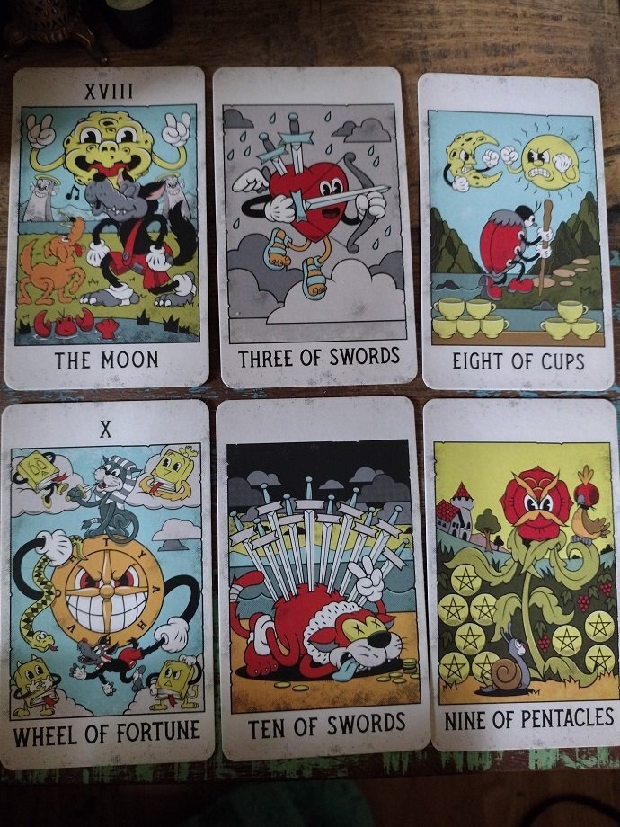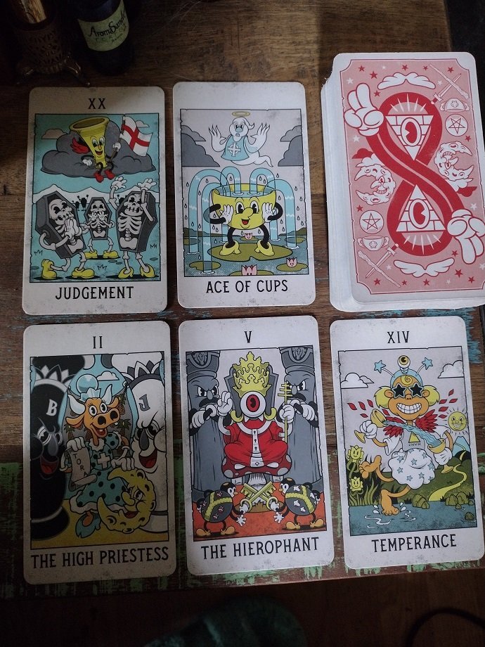 katrinka Posted November 26, 2021 Posted November 26, 2021 (edited) Today another forgotten deck preordered months ago landed on the porch. (And I was just talking about wonky decks here. "Talk about the devil and there he is.") This one is called Mystical Medleys. It's designed to look like vintage cartoons. I love 1930's stuff. There was the risk of getting stuck with a kiddie deck, but I took that chance since 1930's cartoons were actually not purely kiddie stuff, at least until the Hays Code came along and "saved" society from such travesties as Betty Boop's garter. The box is quite heavy and substantial. There's an outer box with a firm magnetic closure on the bottom, and those half moon "grab holes": And there's an inner box, and a little hardcover guidebook. They really went all out with the packaging. (And even with all that, it's inexpensive.) The guidebook is really bad, though. It's ALL filler: jumped-up card descriptions and unsolicited generic advice. Oh well. It keeps the cards from rattling around in the box. See all those black dots? They're on the cards, too. They don't bother me, but I really don't see the point. They're obviously meant to mimic newspaper print. But if they were going for a newspaper comic effect, they should have colored in the images with dots instead of solid colors: https://legionofandy.com/2016/08/26/ben-day-dots-part-8-1930s-to-1950s-the-golden-age-of-comics/ If, OTOH, they were mimicking animated cartoons of the era, they should have left the dots off and used black and white images. Color film existed in the Pre Code era, but it was rarely used. These cards would have been sublime in black and white. So there's an overwhelmingly inauthentic feel to this deck. But it does have a saving grace: irreverence! It follows RWS closely. They even got the snail on the 9 of Pents. Some of the images seem to be taken from the same template. Note the little couples on these: All the Aces feature the cloud that the hand normally emerges from. It's always a gray storm cloud, no matter the suit. And, since it's a purely silly-a*s deck, you get not one squirrel card, but two: The stock is stiff and sturdy. But it has no slip whatsoever, and the cards stick together. Mine have already had a rendezvous with the fanning powder, and they're OK now. Is it a great art deck? No. (I wish Bobby London was into Tarot, he's a wizard at vintage-style stuff. So is Robert Crumb.) A great reading deck? Of course not. But it looks like it could be fun at parties. 😁 Edited November 26, 2021 by katrinka