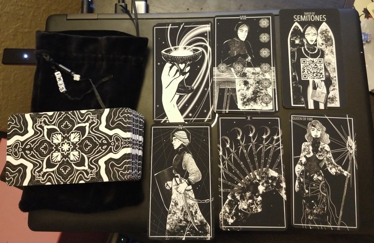 Niobium Posted January 14, 2022 Posted January 14, 2022 I have been remiss in sharing some of my rarer, recent gets. First up: Tarot of Semitones. This one I purchased from the wonderful folks at modernmagic.ru. . No box, instead it came with a lovely velvet bag. 'Rose petal' finish on fairly heavy stock (320+ I'd guess) so a tough shuffle. The art is overall very nice, though I'm a little whelmed by the courts. The rest does make up for it, though, at least for my uses. I'm a huge fan of well-done B&W tarot art, and this is a lovely edition. Overall the theme is Asian, by which I mean the continent as a whole, including Russia. A really great addition along side Of Light and Dust, which has a Middle Eastern theme.