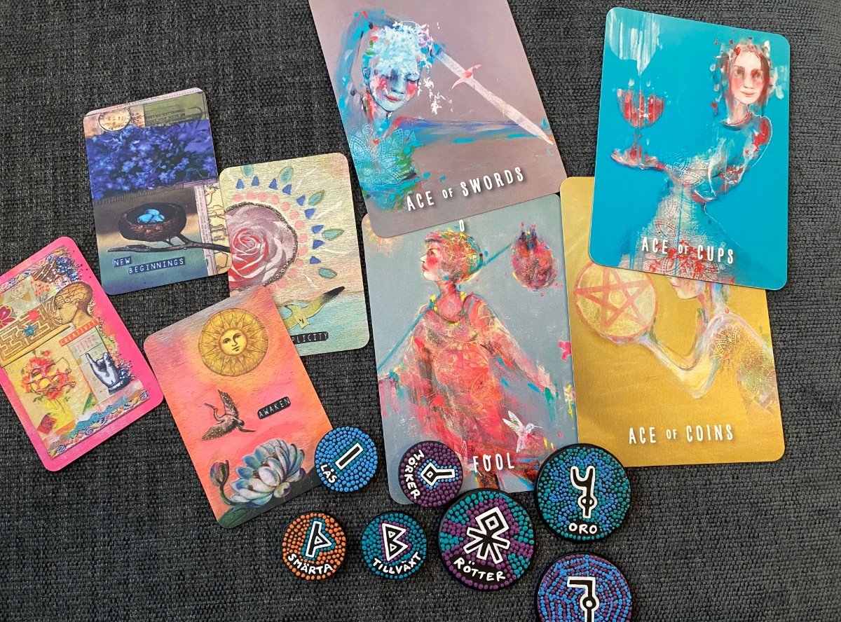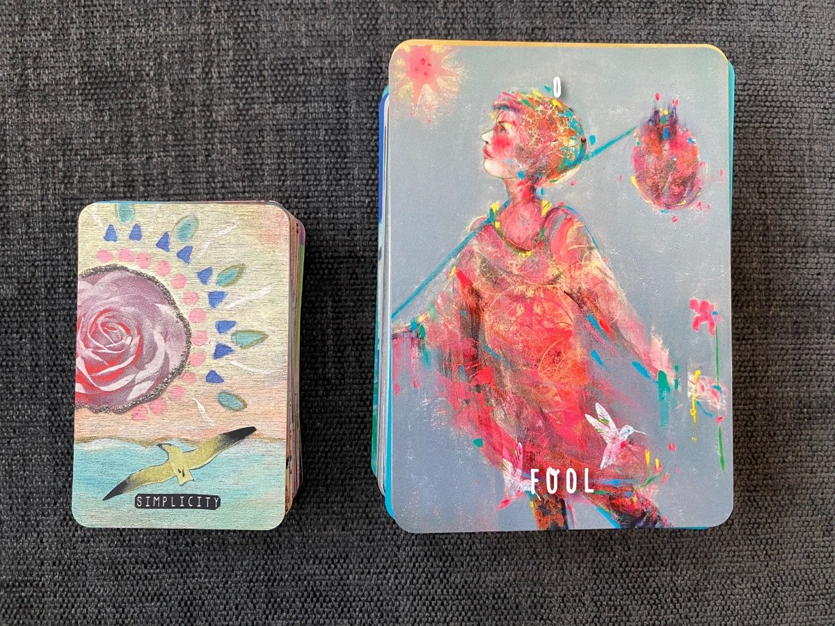 Raggydoll Posted September 18, 2024 Author Posted September 18, 2024 So my new deck just arrived 🥳 I was surprised to see that the guidebook is more like a glossy pamphlet than a standard booklet, however, it seems to have everything needed and lots of pictures, so I’m good with it (though I still wish it would have been smaller and more close to the actual deck in size, for storage purposes..) Here is a sneak peek inside the guidebook. The layout is very reminiscent of the magazines for new deck releases. The information given is very basic but probably adequate for most readers. I really appreciate having full color photos of all the cards. The size of the deck is slightly shorter and wider than your average tarot deck. It’s more like the format you see in Oracle decks. The cardstock feels like it’s of nice quality and the colors are vibrant! I could not resist taking out the Inner Compass Oracle for comparison, because my plan is to combine these decks in readings. At a first glance, they look very good together! 😍 Looking at some more cards.. what can I say? Eye candy! These colors make me so happy! And for some cherry on top, I added my painted runes. Oh yes, I am very happy indeed! How excellent that this deck arrived in time for the full moon. Lots of fun awaits!