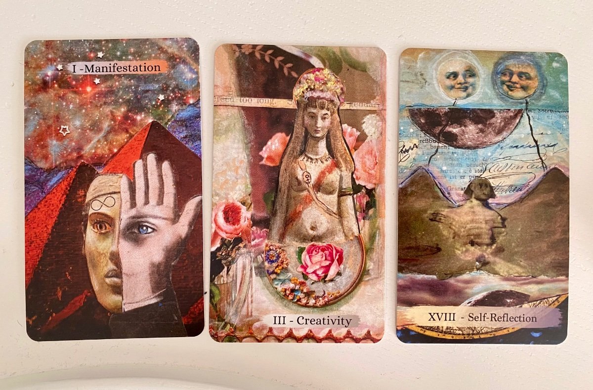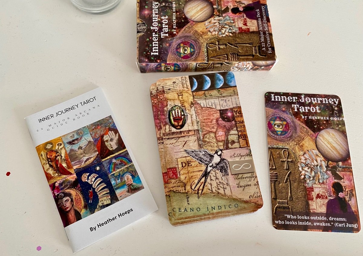 Raggydoll Posted September 19, 2024 Author Posted September 19, 2024 Today I received the second of the two decks that I had ordered. This one is a majors only deck called Inner Journey tarot. It is an indie deck with collage art, created by the artist Heather Hoeps. This is the same creator that made the Inner Compass Oracle. I bought this deck straight from the creator, through her Etsy page. The delivery was quick and everything arrived safely. However, I was not entirely happy about the fact that there was glitter sequins added to the bag 😒. I can imagine that Heather wanted there to be a festive feeling when you open the bag, but to me, it just created extra hassle. The glitter was not only in the bag but it had gotten into the card box, which then meant that there was glitter on the cards and even INSIDE the guidebook 😩. So I spent several minutes trying to rid myself (and my hands!) of it all. Sigh. But once the glitter was all in the trash (such a waste, but I just do not like glitter!!), I could finally look more properly at what the deck and guidebook looked like. I invite you to join me in this process 😊 The cards are a standard tarot size and the cardstock feels nice. What you’re seeing here is the back of the deck, the title card and the guidebook. The art is very evocative and I can imagine that it will work really well for intuitive or even psychic work. It says in the guidebook that Heather draws her inspiration from studies in astrology, spirituality, Jungian psychology, art history and art therapy. I can definitely see that in her deck. And speaking of the guidebook. Here is a sample page: As you can tell, there are black and white images of the card and one full page of meanings per card. I’m keen on starting to work with this deck, likely in combination with other systems 🙂