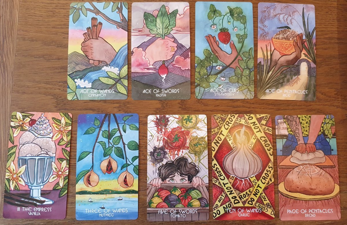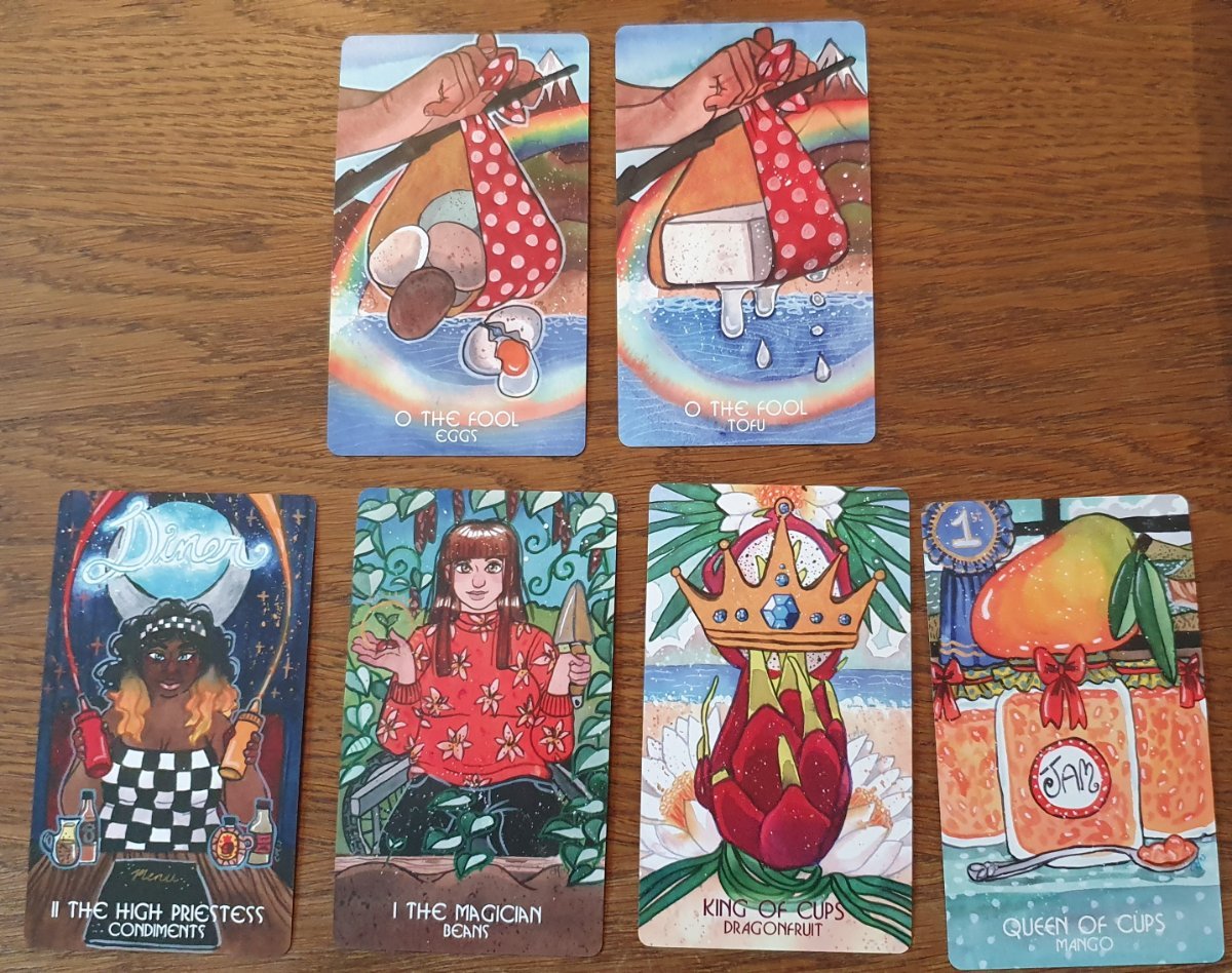 DanielJUK Posted December 10, 2024 Posted December 10, 2024 In recent days, my Kickstarter "The Magic Pantry Tarot" by Cedar McCloud arrived. I am really obsessed by it currently, I pledged to it because I really wanted a tarot deck that was different to everything else I owned and this is entirely food themed! It's vegetarian but has vegan options (see The Fool versions in the pictures below). There is an included spread of a meal (proteins, starches, etc) and one of a set formal table! The guidebook and box have a kitsch chequered table cloth design. It's carefully created to not be triggering or offensive to anyone. This is the unique deck structure..... Major Arcana - Proteins, drinks, condiments, tools, and others Cups - Fruit Swords - Vegetables Wands - Seasoning (herbs and spices) Pentacles - Starches This is going to be really fun to read from!