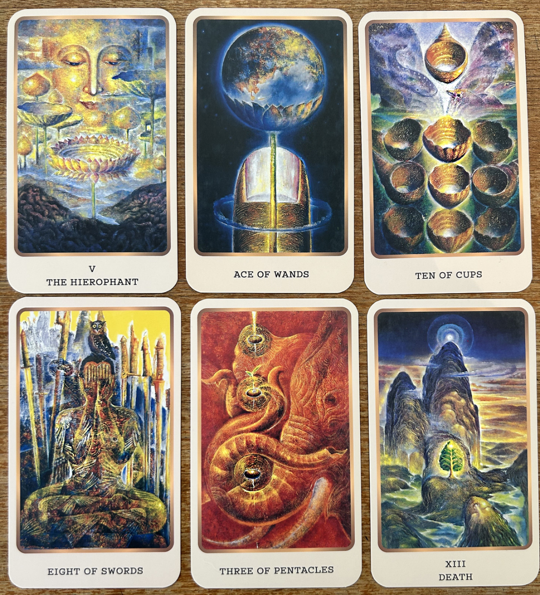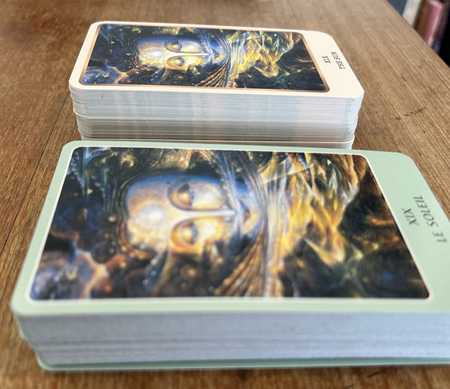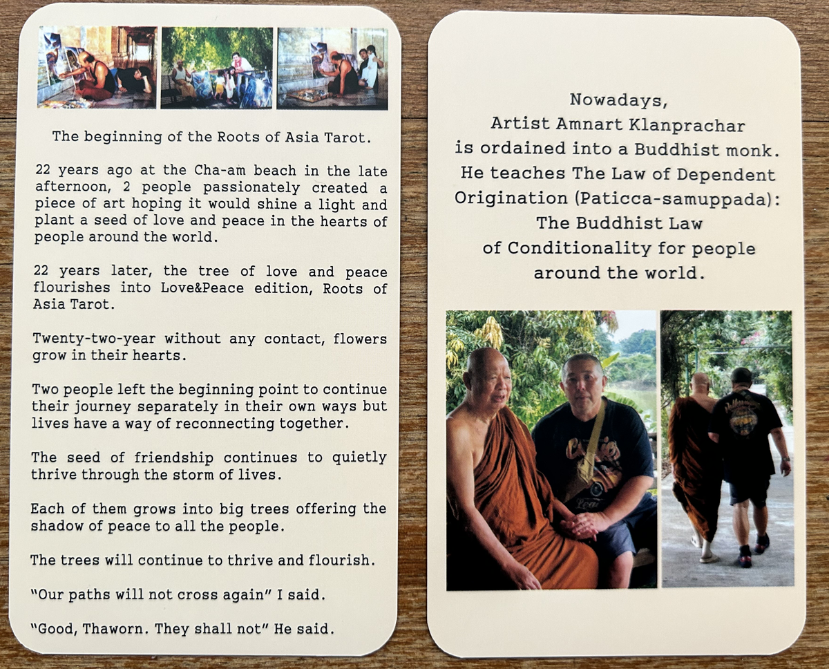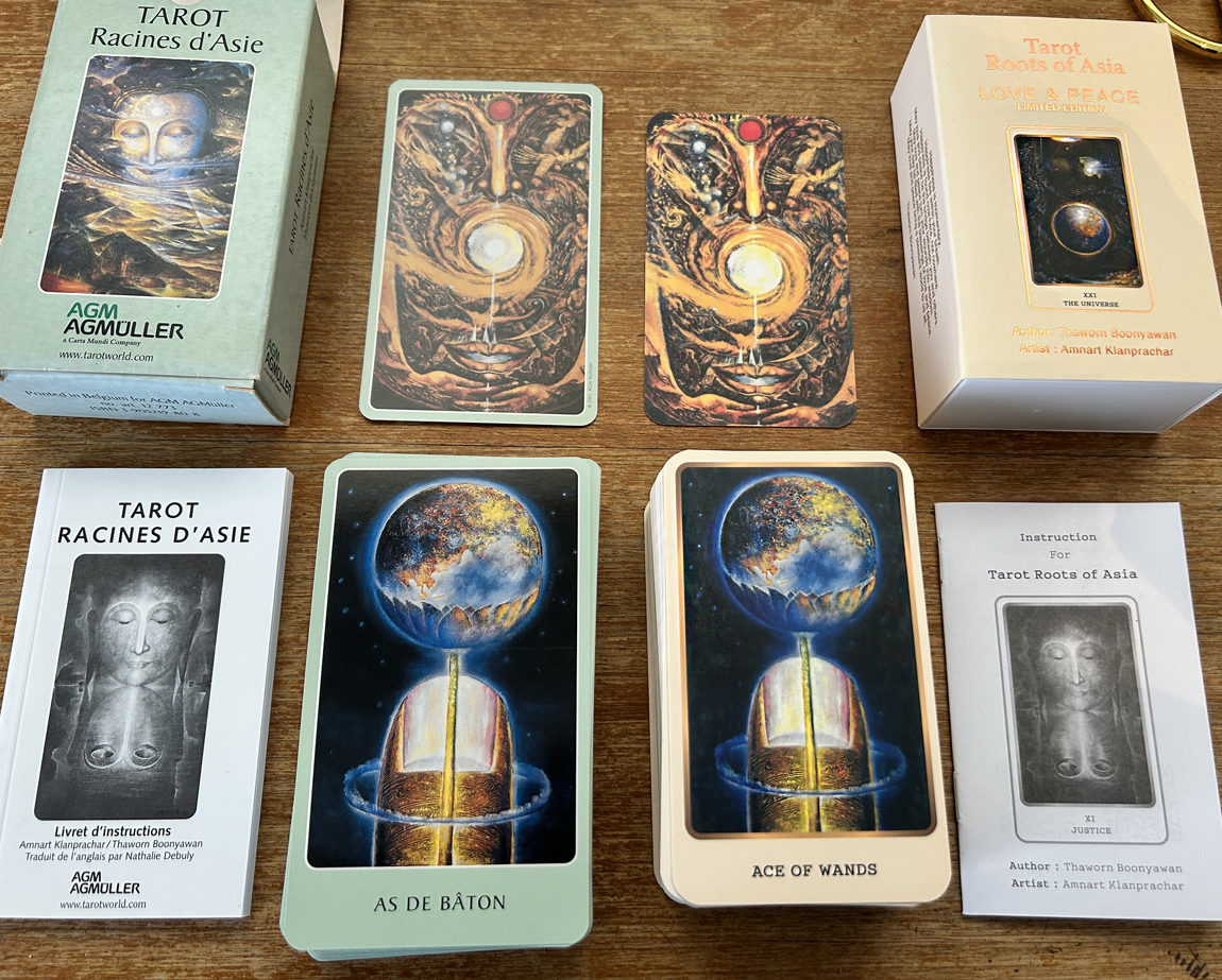 Rose Lalonde Posted September 5 Posted September 5 (edited) Today I received the 2023 'Love & Peace’ edition (for the deck's 22nd anniversary) of Roots of Asia Tarot. It’s one of my favorite decks. (The gold border on these cards isn't gilding - it just looks like it, slightly darker at the corners.) Comparing with the original deck, there are some differences. Border color, obviously. The newer edition is smaller. The back has no border around the art. The font is simpler. The lwb is very short, without the card descriptions of the original, likely because they self published. Card stock is good; it's more matte than the AG Muller (which is also good stock), and slightly thicker. It doesn't feel much thicker when you hold an individual card, but you can see the difference in stack height. Edited September 5 by Rose Lalonde