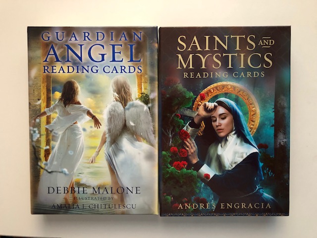 Asher Posted February 13, 2019 Posted February 13, 2019 I am getting excited reading with oracle decks again! I got out my handful and have been playing with them for a couple of weeks now. It's like a breath of fresh air! So, I was a Barnes and Noble today, and found 2 new oracles, one that I wanted to see in person and the other one I had not heard of. And, somehow, they both followed me home... :biggrin: I have been looking for an angel deck (read not Doreen Virtue), and had seen Debbie Malone's 2018 deck, Guardian Angel Reading Cards online. These are stunning! Gorgeous photo-realistic images of angels posed with human beings in a variety of settings. And NO messages or affirmations printed on them, only the title "Angel of..." Sadly, there is not as much diversity as I would like, though there are a few people of color depicted. There are 36 cards in the magnetic closure box, along with a very nice, full color guidebook. The cards are very smooth, leaning a bit to the glossy side of the spectrum, and should withstand careful shuffling. The quality of the set is excellent. The set is published by Rockpool Publishing, a company I have not heard of before. Based in Australia, Rockpool has quite a few oracle decks in their current catalog, and I spent some time looking at the various offerings. I am impressed with the craftsmanship of their products. The other deck that followed me home is the Saints and Mystics Reading Cards. I love this kind of theme, saints, mystics, ascended masters, etc. And what an eclectic group Andres Engracia has assembled. The 36 card deck has 18 saints and 18 mystics, and they are a very diverse group indeed. Several of my favorites are here, including Sts. Anthony, Christopher (yeah, I know...) Francis, Joan of Arc, Jude, Paul, Teresa and Santa Muerte. There are also some that I am not familiar with, for example St.Mary Mackillop, the patron saint of teachers and students (good for me as I work in an elementary school!) The 18 mystics are possibly even more diverse, including Aristotle, Jung, Confucius, Edgar Cayce, Emanuel Swedenborg, Madame Blavatsky, King Solomon, Marie Laveau, Nostradamus, Plato and William Blake. Whew! As with the angel deck, the Saints deck comes in a magnetic closure box, with a full color guidebook. The book offers mini-biographies of each person, as well as a page devoted to oracle interpretations. Beautiful artwork that one could stare at for hours. The cards (in both sets) are 3 3/4 x 5 1/2 inches, the book is slightly bigger, and the box size is 5 1/4 x 7 1/2 inches. I highly recommend checking these out if you are interested in either theme. <3