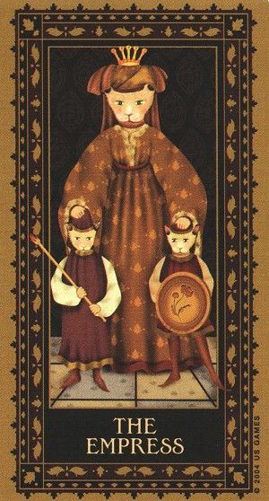 Onaorkal Posted August 22, 2017 Posted August 22, 2017 The Empress card of the Medieval Cat Tarot shows the Empress with her 2 children, something we don't see that often. I guess that showing the Empress pregnant really emphasizes the 'fertility' aspect of the card, but showing her caring about her offspring is even better in my opinion. We can still assume the children are hers, so we still get the fertility aspect, but by showing multiple children you can also add the meaning of abundance. With her hands (paws) on their head, we get the meanings of caring and protection as well. I also like how one of the kittens is holding a staff and the other one a shield. They are typical elements of the Empress card (found in the 3 'main' decks) but here they add another layer ; I feel like the kittens are playing at 'being adults' / 'being Emperor and Empress' and their mother seems to be proud of them. Instead of the Venus symbol on the shield (like in the RWS), there is a red flower, but it seems that many red flowers and fruits are associated with Venus anyway.