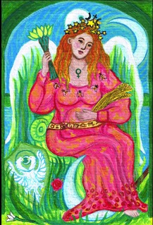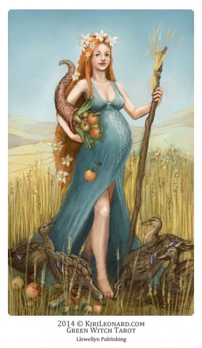 GreenFaerie Posted August 21, 2017 Posted August 21, 2017 Since I posted the Horned God in the Emperor thread, I decided it was only fair to come back and post his consort, the Earth Mother. :) I enjoy this image - the Earth Mother, here, is pregnant, another sign of fertility and abundance, and a nod to her mating with the Horned God and continuing the next generation. Like the younger Empress in the Tarot of the Hidden Realm, she carries wheat and produce, a cornucopia full of apples and vegetables. This is not the potentially vengeful Demeter, or even the fairy empress, who can seem far away and unattainable (as fairies can) when she isn't being warm. This earth mother is all warmth, and the earth isn't hers to rule, but to care for and work in tandem with.