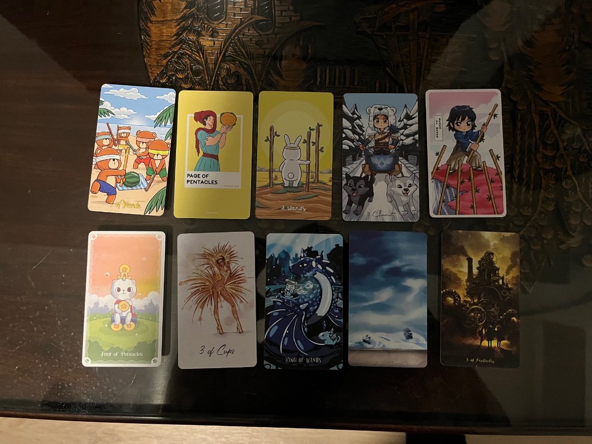 starkless Posted October 30, 2023 Posted October 30, 2023 On 10/17/2023 at 7:31 PM, AlbaTross said: So, when I got my order from Deckstiny, they included a free extra, which is neat...for a thinly veiled attempt at advertising for their other decks, but still neat, and an extra inclusion I wasn't expecting. I suppose it's kind of working though, as I am actually kind of interested in at least identifying some of these. Unfortunately, even after browsing their catalog on Etsy, I have been unable to identify half of them as their catalog is simply to large to sift through in the hopes of identifying specific decks. As a purchaser of the Autumn Miss set, I am familiar with all four of their seasonal decks, so I can tell you that the right two cards on the top row are of their winter and spring sets. The left and middle cards on the same row are of their bear and rabbit themed decks, and I believe the bottom left is their cat themed deck. The card one card over from the left on the top row has the small inscription of Polaroidy Tarot, but it doesn't come up on Google or Etsy searches. I have nothing to go off of for the four remaining cards on the bottom either, especially the one with no text whatsoever. Well, I think I have some feedback for Deckstiny, as a suggestion for making their advertising work better. It would really help if they could include the name of the deck in their sample cards. In any case, how about a fun lightning round? I would appreciate it if anyone can identify any of the decks featured in the above image. The second to the last deck on the bottom row is the Two of Pentacles from the Location Tarot by Deckstiny.