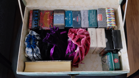 queenofwans Posted January 20, 2019 Posted January 20, 2019 I have a fairly modest collection, so I'm able to store all of my tarot decks in a chest. I keep the decks in their original boxes, unless the box is a larger box, and then in that case, I keep them in a drawstring pouch. The one exception is my Fairytale Tarot, which I keep in this beautiful little book box that I got for a mere $4 at a discount home-goods store. Fits perfectly -- thematically and size-wise!