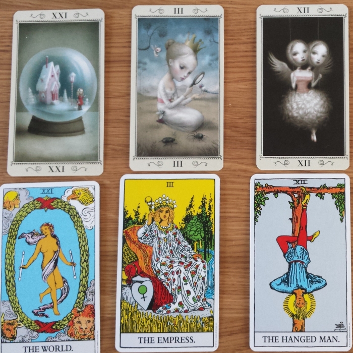 Day Soleil Posted January 8, 2019 Author Posted January 8, 2019 Okay, so my cards are Personality: 21 World Soul: 3 Empress Hidden Factor: 12 Hanged Man (I won't go into this here) My thoughts The World as my personality In the traditional Rider-Waite, the illustration makes me think of a Person Who Marches To The Beat Of His/Her Own Drum. (will simplify to "she/her" for my thoughts). This person's "out there." Not afraid to dance naked in the middle of the blue sky, summoning Power, Vision, Will, and Strength. Being as out-there as she is, she's got a pretty unique perspective on things. Which is good! But maybe also... isolating? I feel like the "isolating" aspect of this card is really amplified by the Ceccoli illustration of the girl standing in the pretty snowglobe with her hands pressed against the glass. Yeah, she's got a unique perspective, but dang if it doesn't set her apart and make her feel separated from the rest of the world. She can't really shake things up. How can the person trapped inside the glass globe shake things up? She can just observe, understand, and react. Right? I'm not saying this is the traditional RW interpretation of The World card. Just my thoughts about the artwork in Ceccoli, and how pertinent it is to the idea that this is my "personality" card. Because, ya. I lived most of my life pretty different from most folk, yet afraid to shake things up. I simply wasn't in that kind of space. I was in my own unique little bubble: observing, analyzing, reacting. The Empress as my soul card I was a little surprised at this card being my 'soul' card because I never had children. But I had desperately wanted to, at one point. And I'd grown up as 'the little momma,' nurturing dolls, pets, strays, underdogs, etc. And becoming caretaker of relatives and animals in my adult life. But I'm also a fountain of creative ideas, and maybe that's where my "empress" strength really lies: in the fertility of ideas. Anyway, I LOVE the Ceccoli illustration of The Empress. If that's not me, I don't know what is. A girl, by herself, sitting on the ground, with a magnifying lens to the tiniest little insects around her. She's analyzing and recognizing the inter-connectedness of all things on this planet. I feel like this is much more my "soul" than the traditional RW illustration, which seems very... matronly to me. Not that aren't aspects of that card that completely match my inner being: the strong connection to the earth being foremost. Well, I feel I've gone on long enough, as who knows if anyone's reading this thread? But I'd love to hear from others about their own personality and soul cards, traditional vs. Ceccoli. I do think there's SOME kind of method to the Ceccoli Major Arcana. I don't know that I'd say the same about the pip cards. I feel like those are pretty... random.