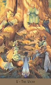 GreenFaerie Posted August 21, 2017 Posted August 21, 2017 Lantana, thank you for such a lovely reading of the Slow Holler Guild card! This is a card that I have trouble with, for many of the reasons you've pointed out. Traditional religion rubs me very much the wrong way. I especially loved your point, though, about the smaller communities that everyone is a part of, and how those influence us. The VFT card symbolizes this idea of small community, I think. The card has been renamed "The Vicar," and he sits in a circle with a group of fairies, both teaching them and listening to their stories. I love that everyone in this card is on a level plane, and the vicar is down with them, part of their community, exhibiting that he is there to guide them but not to be above them. He might keep the fairy lore and have knowledge of the ancient ways of doing things, but he also recognizes that he occupies a position of trust, and that he must show his love for his community and build bridges with them.