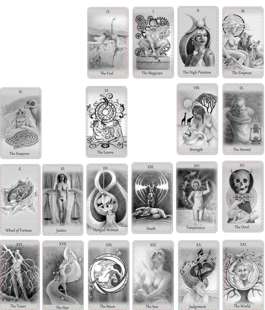 Day Soleil Posted February 8, 2020 Author Posted February 8, 2020 I just uploaded all my images to date into PrinterStudio so I can see how they are looking laid out as a whole. I haven't been drawing these cards in any particular order. I tend to go with whatever is speaking to me in the moment. So I'm finding it really interesting to see where the holes are: what cards/suits I've gravitated toward and which ones I've not yet touched. In the major Arcana, the only cards I haven't drawn are the Hierophant and the Chariot. Two cards I rarely ever pull in self-readings, so I don't have much of a personal connection with them. I'm still stumped for compositions on both of these cards. I'll probably do some guided meditations to "meet" these cards and see if something comes to me. I've not drawn a single Knight. That surprises me. I'm going to give this some thought, because I think it's revealing something important about myself and this project. The only numerical minor card I've drawn in ALL suits is the 5. Wow. I'm also noticing a lack of diversity in my Wands suit.