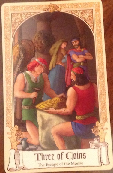 Bookworm Posted May 18, 2018 Posted May 18, 2018 Deck: Fairytale Tarot Card name: Three of Coins First impressions: It’s a busy scene. Two men, maybe in Ancient Rome, are hammering what looks like a metal shield. They have gigantic muscles. Behind them stand a man and a woman, who look like they might be their master and mistress. There are a couple of other metal shields hanging on columns. A little gray mouse wearing a shield? stands on two legs in the lower corner and looks happily up at the two workers. I don’t know what the mouse has to do with this, but the scene looks like it represents the RWS 3 of Coins mastery of a skill or art. After reading the story: It’s a really early story. The image on the card comes from the section of the story in which our heroes need to make a livelihood in a place they have traveled to. They decide to learn a craft – the image here is from when they decided to learn how to make shields – and each time they learn one, they learn it so well that the other practitioners of that craft decide to have them killed. Then they have to move on to a new place. The story illustrates not only the idea of perfecting one’s skill but the envy that can result from those who aren’t as skilled as you. Or I suppose it could also show the envy that you feel towards those who are better at a skill than you are. This is not usually what this card is all about. It’s usually more about the satisfaction that comes from perfecting an art or skill or craft. From the book: Keywords: Mastering a skill or craft; becoming known for what you do; a justifiable pride in your attainment; creating a masterpiece; understanding that “overnight success” takes years of work. Usually this card stands for a team – essentially, it tells us that skills are usually developed with other people, whether as teachers, critics or co-workers. The story is a tale of close relationships and clanships. Once the four friends decide to earn their living through craftsmanship, unbeknownst to them they are set on a path to restoring their wealth and happiness. Even though they are plotted against by those who are jealous of their skill, they never tone them down. They are driven to practice their crafts to the best of their abilities; anything less is impossible. The original story “The Escape of the Mouse,” from The Lilac Fairy Book, by Andrew Lang http://www.sacred-texts.com/neu/lfb/li/lifb31.htm Traditional meanings (from TarotElements.com): Work; a new job or career; career satisfaction; doing a good job; effort; excellence; continued progression; being industrious; productivity; team work; consulting with others; getting outside help in. In its negative aspect: loss of work; dissatisfaction at work; being passed over for promotion; being demoted. From 78 Degrees of Wisdom, by Rachel Pollack The best work combines technical skill and spiritual understanding with energy and desire. Work can raise us to higher levels. It needs to be rooted in the reality of the world and the needs of the community. This card may also stand as a symbol of the developed self. These two meanings do not cancel each other out. Practical work may serve as the vehicle for self-development. My impressions of the card/story combination: I like that the card shows the jealous other shield makers, since that’s a key part of the story and an element of the card that I hadn’t considered before. I also like Karen’s commentary that learning a craft set them on their way to their future happiness, even though a lot happens in between. I like the idea of never knowing where learning something new will lead you. My take (what I make of it/what I might see in a reading where I drew it) I would be more likely now to think of the relationships involved in this card. Previously I had thought of the card as being about perfecting a skill or doing excellent work. But now I would be likely to consider others that are involved in this work, helping the work and the worker along, and those who might be envious and stand in one’s way.