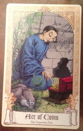 Bookworm Posted March 23, 2018 Posted March 23, 2018 Deck: Fairytale Tarot Card name: Ace of Coins First impressions: A Chinese woman in a blue robe kneels on grass before a small open chest holding gold coins. Near her side, a friendly looking mouse peeks up. Behind them is a stone wall with a fairly large hole at the base. It seems like a bright day. There is a bamboo plant behind the woman, and other green things growing. It looks like the woman is having an Ace of Coins experience in the form of discovering the chest. Or she has found something that she once hid. From the book: Keywords and phrases: Opportunities in practical or business matters; tremendous creativity in some manual or hands-on field; a promise of prosperity and contentment; finding huge joy and creative fulfillment from a craft or skill. The Ace of Coins refers to beginnings and opportunities in the areas of work, the material world or business. In this story the woman is offered the gift of NOT having to work, which is the opposite of what some people are looking for. In her previous life, she has been mistreated and taken advantage of because of her trust, but it is her trust and ability to keep going in hard circumstances that bring her the mouse’s reward. This card is not always about waiting for opportunities to knock, it’s much more about making this possible—and knowing how to build on the possibilities when they are presented. The original story: The Superior Pet, a Chinese tale Traditional meanings (from TarotElements.com): Represents the beginning stages of something tangible; prosperity; growth; material abundance; new enterprise; improving finances or wealth; a solid fruitful foundation; a promotion; a pay rise; good luck; unexpected money. In its negative aspect, an offer of financial help withdrawn; money falling through your hands; missed opportunities. From 78 Degrees of Wisdom, by Rachel Pollack: The gift of the Earth: nature, wealth, security, a joyful life. Spiritual work leads us to recognize the magic in normal things, in both nature and civilization, and then to go beyond them to the deeper truth. My impressions of the card/story combination: The chest of gold coins is the traditional element in the card itself. Karen’s point about the story – how hard work and building on possibilities have a lot to do with the gift of the Ace of Coins – is interesting. I like the idea that, while this Ace, like all the other Aces, represents beginnings, opportunities, courage and optimism, here there is the added element of hard work and the ability to keep going when the going gets rough that comes before the bounty of the Ace of Coins. Even so, this ace, like the others, has its magical aspect. The mouse is the magical creature that gives the gift, so I’m happy he is included in the image. I also like Karen’s idea that this ace can represent “tremendous creativity in some manual or hands-on field” or “finding huge joy and creative fulfillment from a craft or skill” because I haven’t before thought of this ace as being particularly creative, but of course creations are made in the material world, often of material things. The story does not really illustrate this aspect of the Ace, though. My take (what I make of it/what I might see in a reading where I drew it): I think would be more likely than previously to see it as a reward for unacknowledged work, or as an opportunity to use one’s creative powers to make something – probably not a work of art, but something beautiful nonetheless. I might also see it as an inducement to trust in a friend to provide a “magical” gift.