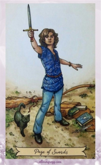 Hemera Posted April 15, 2018 Posted April 15, 2018 Everyday Witch Tarot (D.Blake & E.Alba 2017 Llewellyn) Page of Swords “Initiator” Description: A young man has thrown his books and his broom to the side and grabbed his sword. He is raising his sword towards the sky, but he is still a bit uncertain about his cause (especially compared to the Knight). He is standing on the ground and not moving anywhere (unlike the Knight who is moving fast) Images, symbolism, colours: Books and a white feather next to them. The colours are mild, mainly denim blue and beige. He is dressed in soft blue jeans and shirt From the Book (Everyday Witch Tarot, Llewellyn 2017): -He may be a little too smart for his own good -He is a mixture of enthusiasm and uncertainty Associations (idea from a book by Mary Greer) Animal: weasel, polecat Landscape: suburb Music: rap Art: graffiti Body of Water: brook Traditional meanings (Mary K. Greer): -Bringer of news (esp. troubles or dangers) -Clever, likes mental challenges This card encourages: -Try out new ideas and technologies -prepare to respond quickly to new situations -challenge your mind with something requiring wit or dexterity -protect your position, stand your ground Warns against: -exploiting or hurting others -spying other’s secrets, gossiping -being paranoid Notes: I don’t think he is as tough as he thinks! He is dressed in very soft shades of blue, denim jeans and shirt and he has got soft long curls. Looks like he is trying out a new role he has picked somewhere but he is still experimenting with that role to see if it’s really him.