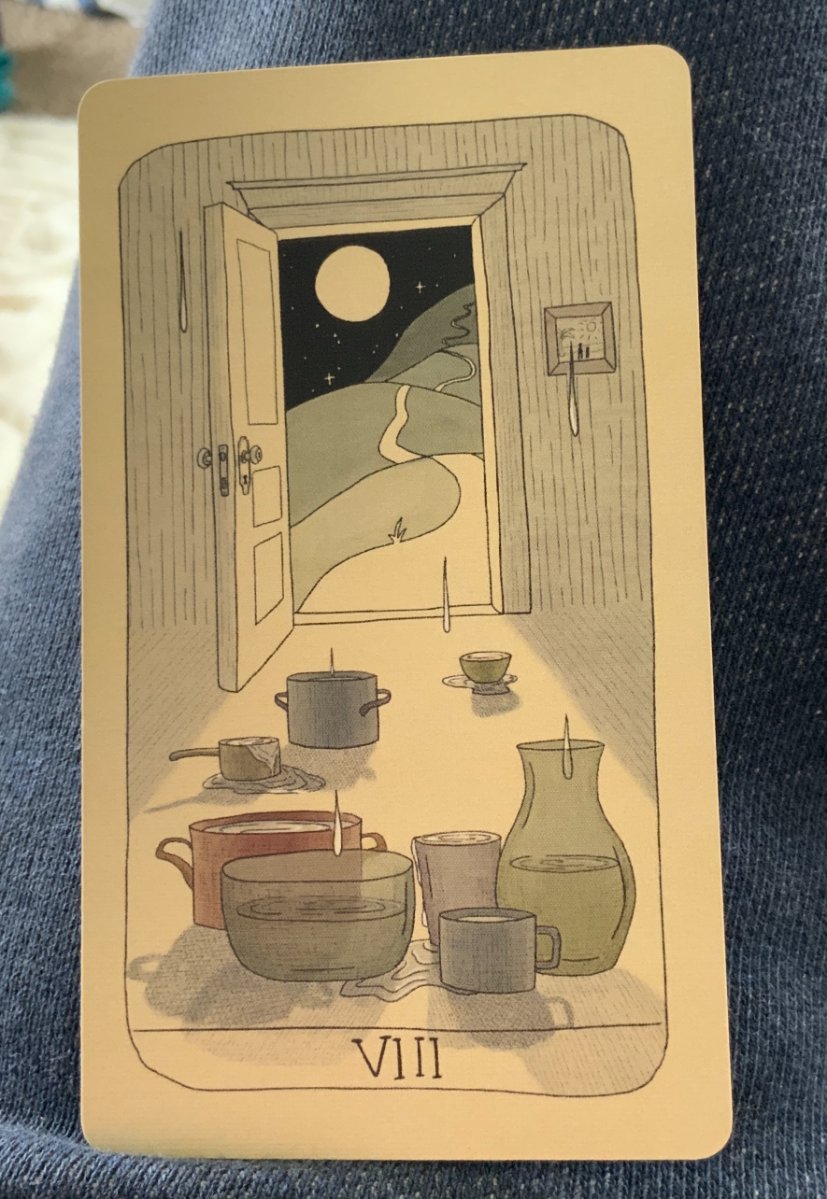 le_charior Posted March 29, 2021 Posted March 29, 2021 (edited) 8 of Cups - Fifth Spirit Tarot The card Eight vessels stand on the floor of a house to catch water dripping from the ceiling. Some of them are overflowing. The door is open and shows a road, leading away from house, the moon, a clear night full of stars. Sometimes it’s good to know when to leave. Leave behind what doesn’t work for you anymore. What it means to me Eigths are order to the second degree - to the point that it can feel suffocating, restricted, claustrophobic, especially in the emotional Water suit. Something too comfortable, too much routine, too much comfort, no movement, no inspiration. This works well with the meaning of these cards, the Fifth Spirit Guidebooks provides these key words: Leaving something once loved, moving on from what no longer serves, a journey into unknown. The Smith-Waite & Fifth Spirit Take On both there is a journey to higher grounds, guided by the Moon. Rachel Pollack notes that on the Smith-Waite deck it’s actually an eclipse, not the moon, which I found very interesting. The sky is clear. The cups are beautiful and well stacked, but one is missing, and it is to find what’s missing that the figure has to take the journey. On The Fifth Spirit the roof might be leaking, but since it’s not raining outside, this is clearly a sign that something is missing inside, something is off. In a reading Spread: Opening of the Book King of Cups - 8 Cups - 9 Swords An emotionally mature and grounded person knows how to decide how to deal with a situation that doesn’t work for you anymore. You can leave it behind, and say goodbye to the things you once loved, if they are no longer good for you. Or you can decide to invest time and (mental) energy into making it work again. Don’t freak out over the seemingly scary assortment of horror movie probs on the 9 of swords, but see them for what they are - tools. You can fix that roof. It might be painful - but it’s an option you have, if you don’t want to or can’t walk away. Edited March 29, 2021 by le_charior