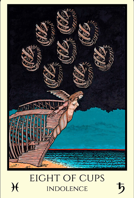 Flaxen Posted April 1, 2021 Posted April 1, 2021 Deck: Tabula Mundi Card: 8 of Cups - Lord of Indolence (Abandoned Success) First decan of Pisces, ruled by Saturn Hod of Briah/Water Trumps: Moon, Universe Thoughts: At first glance, this depiction is very different to other versions of this card. Even the title of it has a different feel to established RWS meanings. Indolence and Abandoned Success give a different impression and one which is not so positive. The eight cups on this card are bleached and cracked boards in the shape of the tube torus portal which appears on the Universe card. From the Moon card, it shows the waters of sleep and the barge has become a ghost ship, run aground. It has been abandoned. Under Saturn’s influence the waters of Pisces are calm but stagnant. Melancholy, regret and the passage of time have spoiled pleasure. Crowley called this card ‘the apex of unpleasantness’ and suggest that indolence inflicts the ill-luck on us. Sloth and inertia are to blame - we just can’t be bothered any more. These cups are unable to hold any water, there is no fluidity. The guidebook states ‘one loses heart and soul and becomes depressed and idle.’ This is how the success is abandoned. It is a much bleaker take than what has become established through RWS. In a reading, this would be a warning that the heart has gone out of the project. People have lost interest and the chance of success has gone.