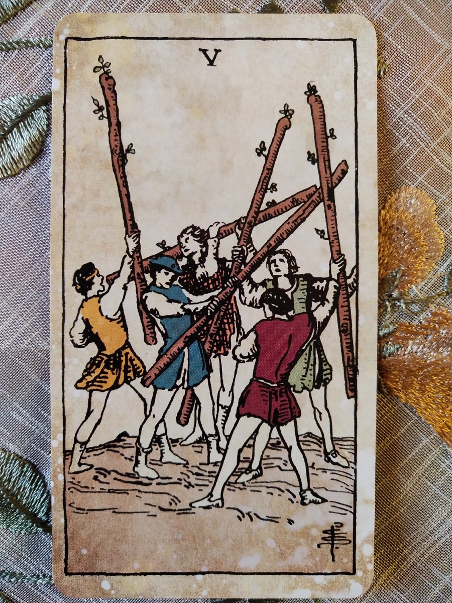 Guest Posted December 31, 2022 Posted December 31, 2022 Week 5 FIVE OF WANDS The Rider-Waite-Smith Tarot Description In the great outdoors, under a calm blue sky, five vigorous youths engage in a free-for-all. All of them wield sizable living wands that sprout varying numbers of branches bearing leaves, except for the contender near the focal point of the scene whose staff is barren, and who is the only one to don a cap, complementing his pure red upper garb. The leftmost lad wears a yellow cloth band on his forehead, the one in the middle wears a light blue checkered overgarment, while the combatant nearest the fore with his back to us sports a white dress with pale blue polka dots. Aside from this, all of them wear medieval tunics, leg hose, and boots/shoes of varying hues of red, yellow, and green. They duke it all out in an uneven yellow and green field. Patches of brown and grey earth are exposed where the action takes place. Symbols Youths - vitality and playfulness. Red and green hoses - clash of ambitions. Varying garbs - disparate stances and objectives. Clean robes and visage - faux battle. Wands - ego and passion. Budding branches - ideas and yields. Yellow and green field - action and growth. Blue sky - normalcy and eventual equanimity. Esoterica Life is naught but conflict and hardship, so it is inevitable that trials come after the perfect contentment and unity of the Fours, bringing us headlong into the fractious infighting of the Fives. However, the astrological decanate of Saturn in Leo blesses us with a gentler path. Rigid and traditional Kronos, whose symbol looks very much like the number 5 and who in this respect resembles Arcanum V as The Hierophant, brings a sense of fair play and graciousness to the aggressive winner-take-all gamesmanship of Leo. Saturn is also the god of wealth and prosperity, having presided over the mythic Age of Gold. Marrying this to the drive and tenacity of Leo, we can see how the card has also been related to nascent material abundance after arduous striving. On the other hand, the disconnect between the pair's temperament may lead to a sense of frustration and, inevitably, fiery rebellion. It is also possible to negatively channel the austere stoicism and melancholy of Saturn into a primally masculine appetite for ruthlessness and rapacity. When the shadow aspect of this card appears, the play becomes bitter and more high-stakes, and the players more cutthroat and antagonistic. In this way, it perversely fulfills the card's Golden Dawn title as the Lord of Strife. Mirroring the benefic influence of Saturn on Leo, the harshness of Gevurah - the sephira of adversity and contraction - is defused by the buoyant optimism of the Suit of Wands to grant us its most cordial aspect. Fire refines the travails and loss that define the former, transmuting it instead into a healthy and energizing competitiveness that makes us hardier and more steadfast. The Pythagorean concept of Five also matches The Hierophant's striving for higher consciousness and divinity, opening us to the sacred, stratospheric possibilities inherent in the full utilization of our life energies. From Waite's Pictorial Key Divinatory Meanings: Imitation, as, for example, sham fight, but also the strenuous competition and struggle of the search after riches and fortune. In this sense it connects with the battle of life. Hence some attributions say that it is a card of gold, gain, opulence. Reversed: Litigation, disputes, trickery, contradiction. Additional Meanings: Success in financial speculation. Reversed: Quarrels may be turned to advantage. Personal Keywords Upright: Healthy competition; Challenges; Sports/exercise; Work in progress; Lively debate/strong opinions; Eventual success/rapprochement; Inauthenticity; Fearless fighter. Reversed: Zero-sum game; Machiavellianism; Obstinacy/intolerance; Viciousness; Chicanery/deception; Stress; Inner conflict/indecision. Ideas Waite himself explained the scene as depicting "mimic warfare", in the form of sport amidst all that strife. Look at their faces - the worst you can see there is intense concentration. There's no rage or bitter rancor. The leftmost youth even seems to be enjoying himself. Check out their clothes - none of them seem soiled or even the slightest bit tattered. Their complexions are all even - no one sports any bruise. No staff is about to hit anyone. In fact, in extremely close quarters as depicted in the card, a weapon of that length is bound to be offensively ineffective. Yes there is conflict, but foremost here is the sense of excitement and vigor that a healthy bout of exercise always brings out. It is an honest and robust tussle parlayed in a thriving field. Any wound one gets here is not aimed to maim or even kill. They're just going to toughen you up, make you stronger and more agile, and instill in you a tighter sense of competitiveness and sportsmanship. Make no mistake though: it is still a worthy game, and you're in the middle of a battle. Everyone here is playing to win, so why won't you? And so it is when this card appears in any reading. It may indicate a bout of difficulty, altercations, and even outright brawls, but the result will hardly ever be either severely detrimental or long-lasting. It simply shows life for what it is - an ongoing impersonal struggle for advantages and dominance. Even if you cannot evade the whirlwind it presages, you will still be able to survive it and come out of the ordeal more resilient and wiser. In its shadow aspect, the flames that should have thrilled and excited you will end up consuming you instead. With foresight, you may simply decide not to throw your hat in the ring, avoiding all that explosive heat in the first place. Or you may barge in as a firefighter - just be aware that you may still end up losing the things you hold dear in the process.