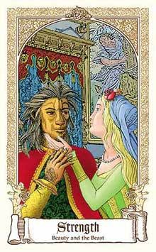 Bookworm Posted November 10, 2017 Posted November 10, 2017 Deck: Fairytale Tarot Card name: Strength First impressions: It’s Beauty and the Beast. Beauty, a lovely (and tall!) blond, leans toward the Beast, caressing his face with her left hand. We see her in profile. She has long hair, which is partially covered with a blue cap of some kind. There are roses on the top. She is wearing a fancy light green gown and a string of pearls. We see more of the Beast’s face, which looks leonine. His hair is mane-like, and he has claw-like fingernails, though he is touching Beauty’s wrist carefully. He is obviously smitten. He wears a red cape. There are tapestries on the walls that feature lions. I can’t remember if I have ever read the original story. Unfortunately, what comes to mind is the animated Disney version (which I loved!), but I look forward to reading the story. From the book: Keywords and phrases: Calmly showing strength under pressure, patience and a quiet persistence, courage and fortitude, inner conviction of purpose, a quiet mind is stronger than physical force Beauty is the gentlest person in this story, also the strongest. In many ways she is the classic “fool,” yet she is brave, insightful and loving and compassionate. She can see beneath the skin. This in contrast to her shallow siblings and her weak father. She alone is able to see true beauty and go about her life with a calm courage, unperturbed by the ups and downs that come. This card often refers to forms of strength that may not at first be obvious. Real fortitude is often about perseverance, trust and faith. Beauty is quiet, calm and seemingly malleable to her father’s will, yet when things are nearing disaster, she has the inner strength of know what to do, and belief in her own judgment. The original story Beauty and the Beast, by Jeanne-Marie LePrince de Beaumont http://www.pitt.edu/~dash/beauty.html Traditional meanings: Inner strength, self-assurance, self-control, self-belief, patience, confidence, enjoying power, lust, sex, sexuality, eroticism, heroic acts, strength through personal power & not violence, vitality, virility, potency. Weakness, fragility, lack of self-control or patience, lacking courage, needing support, self-doubt, someone who is overbearing, breaking your own moral code, vanity, hedonism. My impressions of the card/story combination: The story seems like it might have been dreamed up to go with this card since it so perfectly illustrates the idea. One thing I thought of that I hadn’t before when considering this card is that much of Beauty’s strength comes from her ability, demonstrated repeatedly, to see beyond the trivial. She is the only one of the her sisters not to be distraught when her father loses his money. Her happiness does not depend on living the high life. She can see beyond her fear to understand that she needs to go to the beast’s castle in order for her family to be safe. Her strength comes from a clear understanding of what needs to be done. At first she rejects the Beast’s proposals of marriage, even though she’s afraid of him, because she does not yet love him. And finally, once she understands that she really does love him, she is able to see beyond his frightening appearance. My take (what I make of it/what I might see in a reading where I drew it): I think I would see that strength depends on clear thinking, which in turn depends on an ability to see what’s important, rather than being swayed by appearances and letting fear cloud one’s thinking.