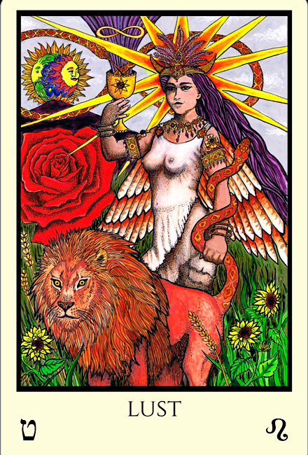 Flaxen Posted March 15, 2021 Posted March 15, 2021 Deck: Tabula Mundi Card: Lust - Daughter of the Flaming Sword, Leader of the Lion Zodiacal Trump: Leo Hebrew Letter: Teth (serpent) Tree of Life path: 19 from Chesed to Geburah Thoughts: This depiction shows a goddess grasping the serpent-lion. There are many goddesses associated with large cats and they tend to have vigour, fierceness and sex associated with them. The lion is representative of Leo and the sun. The red lion is also an alchemical symbol - willpower directing vitality and integrating and transforming the animal nature. The goddess holds the same Grail which was carried by the charioteer. There is reference in the guidebook to the woman also being the Moon illuminated by the Sun. She is Babalon and also a reference to the Aeon of Horus. This is the Age of Aquarius which is an axis of polarity - Aquarius - Leo. The red rose is a symbol of the root chakra where the kundalini rises. Overall, there is a sense of here of joy in strength. A vitality comes from transforming our animal nature and following our passions with courage.