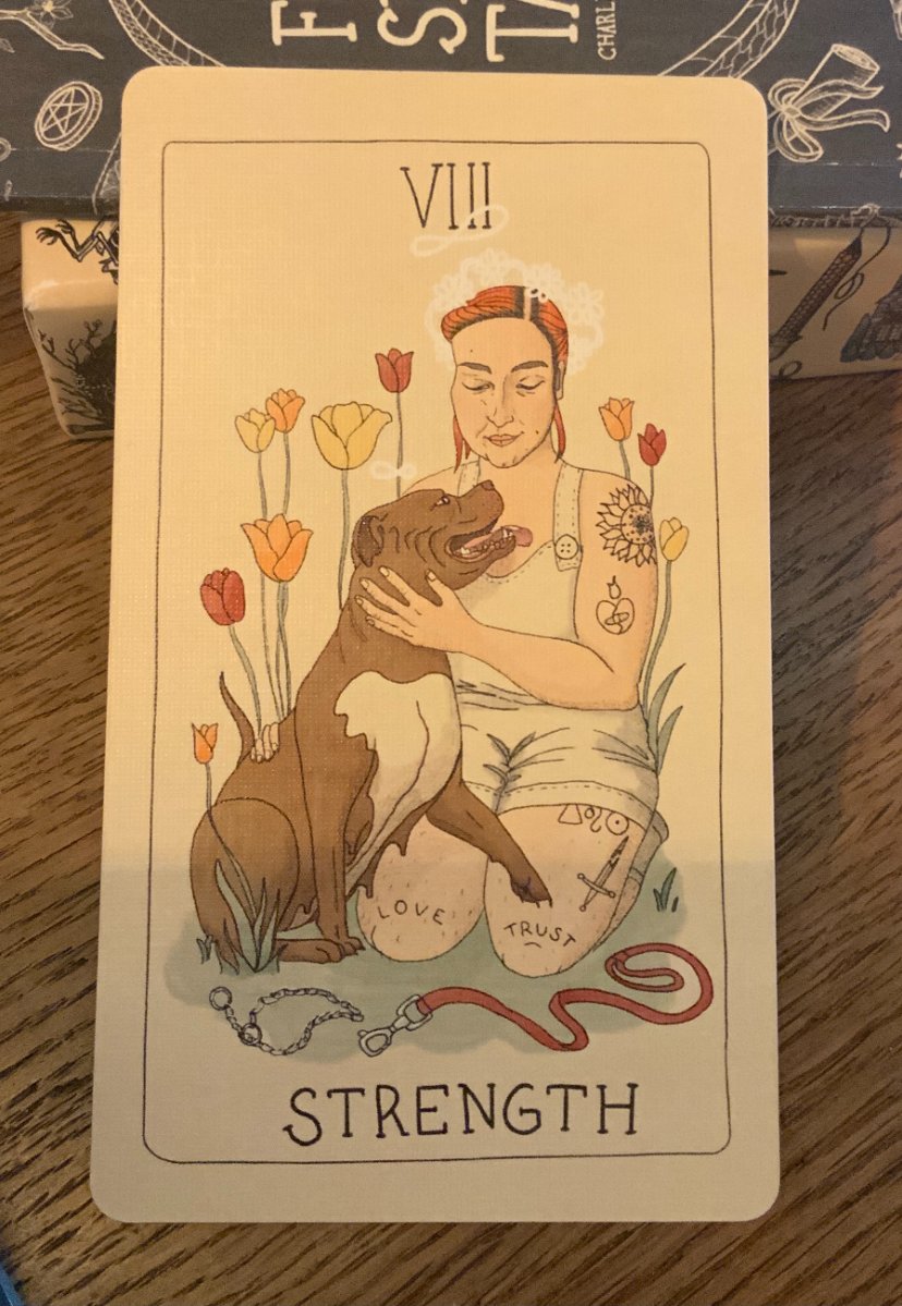 le_charior Posted March 14, 2021 Posted March 14, 2021 (edited) Strength - Fifth Spirit Tarot The card A person, seated on a meadow with flowers behind and around them, has taken off the leash and collar of a big dog and is caressing it. The dog - one of these dangerous looking dogs, that is actually only dangerous and mean when mistreated by their owners, is licking them and enjoys the touch, the bared teeth no danger to the human. The collar is one of these mean ones that really choke and hurt the dogs. The person has an infinity sign floating above their head - so does the beast. This is really close to both the TdM and the Smith-Waite Strength card, in imagery - the seamlessly effortless control of the beast, maybe there is even more intimacy here. It’s not a lion, so we lose some of the symbolism of this animal - but replacing it with a dog breed that tends to get misunderstood and feared, not for their nature, but for what humans have made them sometimes, is a different and to me very fitting symbolic. The infinity signs link it back to the Magician also. Rachel Pollack writes very beautifully about the card in 78 Degrees of Wisdom - I could quote the whole chapter, basically! (Will add an image of the card tomorrow, it's too dark to take a decent one now) What it means to me From strength through control in the Chariot, and from even earlier systemic strength of the Emperor, we move into true, authentic strength - by embracing our fears and inner demons, not suppressing them anymore, but giving them love and attention and integrating them into our being, to become a fully formed person. The Tibetan Buddhist practice of Chöd - of feeding your inner demons instead of struggling with them - comes to my mind. While Strength is an easy card in the sense that I understand it well, it’s for me one of the hardest cards to really embody in its quality. I tried to come up with a reading to give me an idea how I can integrate the qualities of Strength more in my life, but nothing so far really worked, so I will revisit this later again, and continue to keep the presence of Strength with me for a while longer. Edited March 15, 2021 by le_charior added image