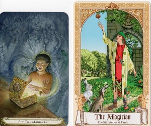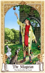 Bookworm Posted September 21, 2017 Posted September 21, 2017 Deck: Fairytale Tarot Card name: The Magician First impressions: This is a recognizable magician -- adult male, arms in the “as above, so below” position, an audience -- but there are some puzzling differences from the RWS traditional image. He is dressed oddly. He wears a red tunic with a strange woven green bottom. Over that is a light green robe with a leaf or flower pattern. He also wears a separate dark green hood-like garment that covers his head and upper back. With his upward stretching right hand, he looks at and reaches for a bright multi-colored fruit that hangs from down from a tree branch. His downward stretching left hand holds a red flower. Another unusual feature is that his audience is comprised of a rabbit and a dog, who are watching him with great interest. He stands in front of a castle or church. It’s a beautiful, sunny, summery day. There are big, leafy trees, green grass and flowers. From the book: The Story Teller at Fault, from Celtic Fairy Stories, Joseph Jacobs Keywords and phrases: Trickster and performer; transformation, in a flash; energy and a sense of wicked fun; creative inspiration; dazzling juggler of ideas and people; brilliant mischief; magic at his fingertips; transformation and surprise The Magician is a tricky figure to read or predict. He is an archetypal force; god-like and allied to Hermes, teacher of mankind but also a trickster. The flashes of inspiration the Magician brings can result in a careless kind of cruelty as well as inspiration and a spark of genius. There is nothing comfortably entertaining about this magician--you are his dupe as much as his appreciative audience…. The element of the ladder to heaven [in the story, the Magician throws a ball of silk into the air, which becomes a ladder] reminds us of the traditional Magician who holds one hand up into the sky as a conduit for energy to pass between heaven and earth. This card can signal an amazing flash of creative energy and inspiration, or simply an illusion that tricks the imagination. Or, at its more intriguing, it can point to both at the same time….When we can recognize that both aspects can co-exist, we truly understand the nature of Hermes, and of the Magician. The original story http://www.surlalunefairytales.com/authors/jacobs/celtic/storyteller.html Traditional meanings Creativity, action, power, manifestation, skill, communication, technology, magic, work, self-employment, a smooth talker, having the gift of the gab, will-power, directing your will, creative visualization, manifesting your desires, deceit, con artist, liar, communication blocks, abuse of power, creative stagnation, ill intentions, manipulation, fake skillset, a charlatan, ill intentions, being out of your depth. My impressions of the card/story combination: The image on the card is something of a mash-up of the story, in that a hare and a dog appear in the story, but they are never the Magician’s audience, as depicted on the card. There are actually two separate incidents in the story with two different hares and dogs. The shiny thing up in the tree is not a fruit, but a ball of silk, which the Magician (or the beggar, as we know him in the story) throws up in the air to create a ladder, which first the hare and then the dog shown on the card climb and disappear. The weird outfit worn by the Magician just shows that he is a poor beggar. I had thought there might be more to it, but I don’t think so. He is standing in front of the castle of Red Hugh O’Donnell, where he performs many tricks and feats of magic. He goes so far as to kill people, but then we find out that they weren’t really killed, or if they were, he brings them back to life unharmed. The story teller, who loses everything to the Magician early in the tale, has when we meet him for the first time, been unable to think up a story, and he is at a loss about what to do. It isn’t until the end of the story that we learn that the beggar has played all his tricks, many of which make use of real magic, simply in order to provide the story teller with a story for the king that evening. My take (what I make of it/what I might see in a reading where I drew it): I really love this depiction of the Magician. He is an amazing creative force. He can be casually cruel, but his cruelty is reversible. While he’s not malevolent at all, he makes use of our weaknesses (for gambling, for being gullible) in order to play his tricks. We want to believe in his magic, even though we should know better. We want to be entertained, and he is a great entertainer. The Magician is disguised as a poor beggar. Like this deck’s version of the Fool, we are encouraged not to pay too much attention to appearances, since they can be so deceiving. In a reading, I might see this card as a creative solution to a problem from an unlikely source, a burst of creativity, a warning about overconfidence, or a warning about an actual person who is trickster. Taking a cue from the book, I think I’ll try to see the card as an indication of an illusion that can also be a creative inspiration. Maybe creativity sometimes presents itself first as an illusion, and the trick is to turn it into something real.