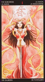 Onaorkal Posted September 25, 2017 Posted September 25, 2017 Manga Tarot The Sorceress - I A woman is facing us, her arms held above her head as her hands seem to encircle a large sphere of white light. She is dressed in red, her clothes reminding me of some belly dancing costume. The bra part reminds me a bit of seashells and her armbands really look like lotus flowers. She is wearing a large golden necklace and some horn-like symmetric jewel at the top of her forehead. A sword is standing upright in front of her with its tip facing down. Something that looks neither really solid, neither really liquid, neither really gaseous, golden yellow in color, is swirling its way around her in 'volutes' or 'streams'. It looks like the background is covered in a dense red smoke. Colors : Red and gold Season : Spring LWB : Will. Decision-making ability, beginning of a journey, courage, energy. Will and equilibrium are the basis of every action. First impression : This card feels very dynamic, with all the golden volutes swirling around and the large sphere of white light at the top of the card. Even the sorceress' hair and the bottom of her clothes seem to be full of life/movement. There is definitely some magic at work in this card and the woman looks focused and totally in control of what is happening. The look on her face and her body position denote no hesitation at all. At the same time, we don't really know what is going on, we don't know what's the light sphere for, what's the sword for, what the golden volutes are and a thick cloud of smoke prevent us from seeing the surroundings. Overall, it is a very mysterious card. What others had to say : -Some people were seeing the sphere of light as the Sun. -Most people couldn't identify the nature of the golden yellow volutes either. -Some people were seeing flames and not smoke in the background. -Overall everybody seems to have a very personal take on this card, which shouldn't be surprising, with all the elements being so mysterious. Symbolism found in the card -Sphere of light : Can represent the Sun or focused energy. Circles represent the infinity and white is the color of purity. -Spring : Symbolizes budding energy. The kanji is written inside the sphere of light, as if to put an emphasis on it. Spring is also related to beginnings. -Clothing : Reminds of performance clothing. The Juggler from the Tarot de Marseille's tradition is definitely a performer, so this aspect could totally suit this card. -Lotus flowers : In Buddhism, lotus flowers are associated with spiritual enlightement. -Forehead jewel : Reminds me of a kuwagata maedate, which is a stylized deer antlers decorative crest commonly found on the front of samurais' helmets. Its official symbolism is unclear, but it definitely gives off an aura of power and magnificence. -Red color : Associated with the root chakra and grounding, but also with passion and fiery energy. -Gold : For me the jewels, the hilt of the sword and the mysterious 'volutes' seem to be either made of gold, or gold in color. It's a symbol of wealth, power, success and masculine energy. -Golden swirls : I couldn't help but think of the alchemical concept of gold transmutation when I tried to analyze the presence of these golden swirls around the Sorceress, especially since the Magician is often called 'The Alchemist'. -Curves : This card is full of round shapes and curved lines. The sphere of light, the body of the Sorceress, her clothing, the golden swirls... It's associated with feminine energy, which compensates for the masculine red color and the 'deer antlers' jewel. It also reminds of the flowing nature of energy. -Symmetry : The almost symmetry of the image brings a sense of stability to this otherwise very dynamic card. -Sword : Symbol of both physical power and intellectual clarity. -Smoke : Adds an aura of mystery, as something might be hidden from our view. Synthesis/conclusion : After a week of working on this card, I still find there are some elements I couldn't make sense of, but overall the message of the card is quite clear anyway. A lot of power exudes from this image and I think that depending on the reading, different elements or details might pop out more.