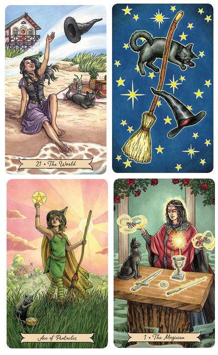 Hemera Posted September 22, 2017 Posted September 22, 2017 The Magician - Everyday Witch Description: The Magician is standing by her (his) altar and focusing on the 4 tools in front of her. A black cat is sitting on the table and watching. Images and Symbolism: -the 4 tools: Sword, Wand, Chalice and Pentacle -black cat, sitting like Bast -red roses -fog everywhere (beautiful and circling around mysteriously) -wooden table top on a huge old tree trunk (which is still standing where it has grown) -silver crown with the moon, like the one priestesses sometimes wear Colours: -red, blue and gold (Magician’s dress) -aquamarine (sky and the fog floating all around) -red (roses) -wood (table) What action is going on: There is not much action. She is making magic. She is waving her hands about in an uncertain manner. She is not *directing* energy anywhere. The energy waves around her hands are rather like the fog circling about around her feet. Maybe the action is more inside her head? This card encourages: -to use your tools and talents -to protect and love people & processes -trusting in your abilities Warns against: -centering too much on doing -tour de force -being too hard, demanding, dogmatic, exacting -this particular Magician warns against being too vague, weak & undecided in a situation where action and decisions may be needed Traditional meanings: -realizing your potential -action; carrying out plans -creativity; using your talents -knowing what you are doing and why -focusing on a goal -having vitality, feeling vigorous and energized -therapist, alchemist, artist, occultist From the Book: -You can do this, you will succeed, you have all the tools Sallie Nichols: (in Jung and Tarot. An Archetypal Journey. Weiser 1984) -serious professional, dedicated artist -ONE; monotheism, successor of Thoth and Hermes -active, light, bright, masculine, penetrating -can be sterile and rigid -“All artists are Magicians for they juggle the forms of everyday life into transcendental patterns” Notes: -there is something that I don’t like about this Magician. She isn’t very convincing and she doesn’t seem to be powerful enough to manage all the tasks a Magician should. She is not *directing* energy, just waving her hands about in an uncertain manner. -the author writes that this figure is meant to be androgynous. Maybe it is that Priestess headdress but she looks more like a woman to me -the golden light at her chest is supposed to be where her heart is but it is too far to the left! Quote: “The core of magic is to summon an image and the power to work with that image.” (Anais Nin)