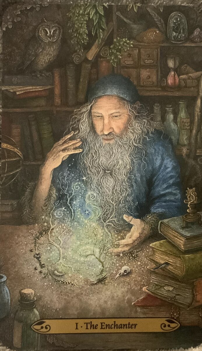 Riimukissa Posted September 7, 2020 Posted September 7, 2020 (edited) Late but trying to catch up... The Magician Deck: Forest of EnchantmentName of the card: 1 - The Enchanter Description: A wizard looking old man with long beard is doing magic by the table. He has a blue hat and a blue cloak with fur on the sleeves. His right hand is up and the left one down as if he is holding an invisible ball. He looks intensely down towards his spell. The spell manifests in a circle formed of small items including feather, key, claw/tooth, herbs, ring and a bird skull. The spell forms light green spiral that raises up, around it something that looks like four small trees. The spell is shining light to the man’s face. On the table there’s also candle stand with a burned melted candle. The candle is still smoking. Under the candle stand there are four books, between the two middle ones you can see a blue feather, leaf, some paper and herbs. There are also two bottles on the opposite side of the table, one almost hidden from the view. Behind the old man there’s a bookshelf with lots of books, bottles, hourglass, scrolls, bugs, plants, mortar and pestle, boxes and an olw. The owl is looking at the viewer. There’s also wand and this round thing on the left that I don’t know what it’s called. First impressions: At first glace this guy has too much stuff. I think he needs a bigger room. He differs from the traditional Magician but I could find him surrounded by all the elements/suits. His hands could also mean ”as above, so below” even though the gesture is not as clear as in RWS. Meaning at a glance according to the guide book: Magic. Wisdom. Force of will and intention. Ability to influence and help. Power at your command. Symbols: Old man, books – knowledge Trees – growing, manifesting Spiral – creation and growth Owl – wisdom, silence Hourglass – time The man reminds of the Merlin of King Arthur’s time. He was a wizard or sorcerer, a prophet, a bard, an adviser and a tutor. Merlin was the last of the druid, the Celtic shaman, priest of nature, and keeper of knowledge, particularly of the arcane secrets. Traditional meaning: Upright: Manifestation, resourcefulness, power, inspired action Reversed: Manipulation, poor planning, untapped talents Numerology: 1 Independence, self-sufficiency, self-determination, leadership, beginning Numerology Link: 10, The Wheel of Fortune, 19, The Sun The suit / element: Air Air is the element of intelligence, creativity, and beginnings. Astrology: Mercury The planet of day-to-day expression and communication. Mercury’s action is to take things apart and put them back together again. It is an opportunistic planet, decidedly unemotional and curious. Edited September 7, 2020 by Kati