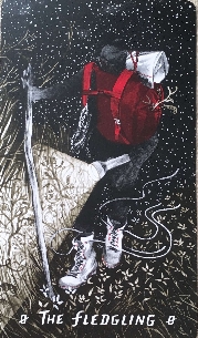 Lantana Posted September 18, 2017 Posted September 18, 2017 "Trust your adventurous self. Start over. Remember your innocence. Mock and play. Be spontaneous. Risk looking foolish. Trust your path. Take a plunge. Leap before you look." At first glance, the most striking thing about the card is the lack of a visible body. This brings up the idea of zero: We are nothing, but we have the potential to be anything. The figure has no identity right now, but one will be gained, transformed, and actualized throughout the journey. This can relate to anything, but I do think the lack of a body is interesting from a trans perspective. When reading with a queer lens, the Fool is often a symbol of coming out of the closet or starting to transition. The figure here has a subtle, shadowed form: Is this outline something they are trying to fill into, or an imposed boundary they are starting to break free from? "Refusing convention' date=' the Fledgling exists outside social norms, re-imagines inheritances and traditions, and reveals uncomfortable truths through storytelling. When you work with the Fledgling, you're able to embrace the impulsive freedom of doing the unexpected and bucking social norms, while reconnecting with your innate innocence and ability to trust."[/quote'] The Fledging appears to be hiking, instead of falling off a cliff. They travel in darkness, with just enough light to see what's ahead but not much more than that. There's feeling of "moving away from home", a common experience for both queer people and Southerners, or at the very least that something is being left behind without looking back. The Fledgling seems a bit more prepared than our usual Fool, having with them a huge red backpack (complete with maps and rope) and a formidable walking stick. While there is still nativity and innocence, the Fledgling isn't hopping out completely carelessly, despite what their untied shoes might say. This is one of the Major cards in the deck with a name change. Most of them are done to sidestep binary gender or European-focused cultural symbols, but I'm not quite sure why this has been changed. Perhaps the Fool title comes across as a bit harsh to some, or perhaps they wanted to get away from the court jester symbolism the Fool sometimes carries. The Reversed keywords are "Inhibition, shyness. Not yet time to begin. Try a small step before taking the big plunge." Artist: A-B Moore