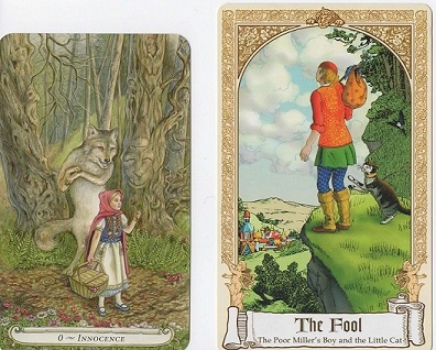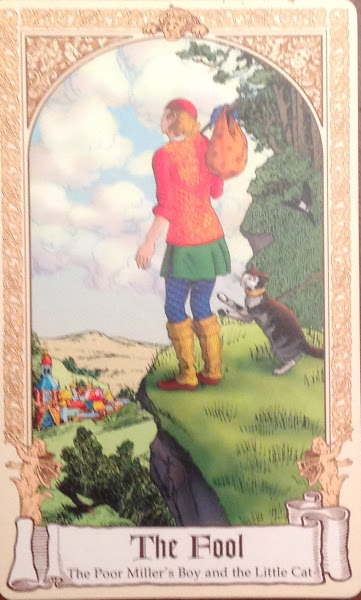 Bookworm Posted September 9, 2017 Posted September 9, 2017 Deck: Fairytale Tarot Card name: The Fool First impressions The Fool here has a cat with him, who looks as though it is trying to get his attention. The Fool, a young man, is turned away from the reader, looking out from a green, grassy cliff. I like that he has his back to us, so his perspective is our perspective. The sky is blue with white fluffy clouds. From the book The Poor Miller’s Boy and the Cat, from Household Tales, by Jacob and Wilhelm Grimm. Keywords and Phrases: Foolish wisdom, chaos and freedom, blind faith, stepping into the unknown, trusting in fate and fortune, throwing yourself into the arms of luck, taking a leap of faith, fortune favors the innocent fool. His innocence acts as a protection, the fool avoids many dangers and pitfalls around him, without ever once using his brain, or anything much beyond his kind and trusting instincts. When this card comes up in a reading, it can be good to think of all the fools in fairytales: kindness, trust and optimism. The original story https://www.cs.cmu.edu/~spok/grimmtmp/081.txt Traditional meanings New beginnings, spontaneity, adventure, innocence, potential, faith, fearlessness, a leap of faith, originality, freedom from constraints, purity of action, acting without malice, being in the present, acting without thinking, eccentricity, silliness, seeking freedom, folly, stupidity, not thinking through plans properly, chaos, lack of direction, poor judgement, being gullible, naivety. My impressions of the card/story combination: The image shows a fairly traditional fool. He has his knapsack with everything he needs, and his companion, the cat. In the story, the Fool is the stupid third son who everyone in the family thinks will amount to nothing. He is treated cruelly, but doesn’t dwell on it, just goes about his business and encounters magic along the way. While the end result of his journey is truly impressive, his success seems to prove that what’s important is the journey and not the destination. What's unique in this Fool card is the major role played by the cat, which seems to represent allies, or magic. My take (what I make of it/what I might see in a reading where I drew it) I think I would emphasize the importance of striking out on your own path, even when it seems scary, trusting your instincts in starting something new, not paying attention to what others think, taking a chance on something, even when it doesn’t make logical sense, and the importance of enjoying the journey, not focusing on the destination. Also the importance, when you are starting something new or out on the road, of being open to accepting help from allies, or companions, who, though unlikely, may know more about your journey than you do. Further Thoughts You rarely choose to be the The Fool unless there are no other options: birth, going to school, etc. But sometimes there is no other choice, and that's when magic is likely to happen. In thinking about my own relationship to this card, I thought about starting school or moving to a new city or starting a new job. Allies and friends you make as you are making your way in the world see qualities in you that you don’t necessarily see in yourself, just as the cat saw a future king in the Miller’s Boy. Friends’ faith in you can be instrumental in your becoming who you become. In short, I like how this card emphasizes the crucial role of allies for the Fool.