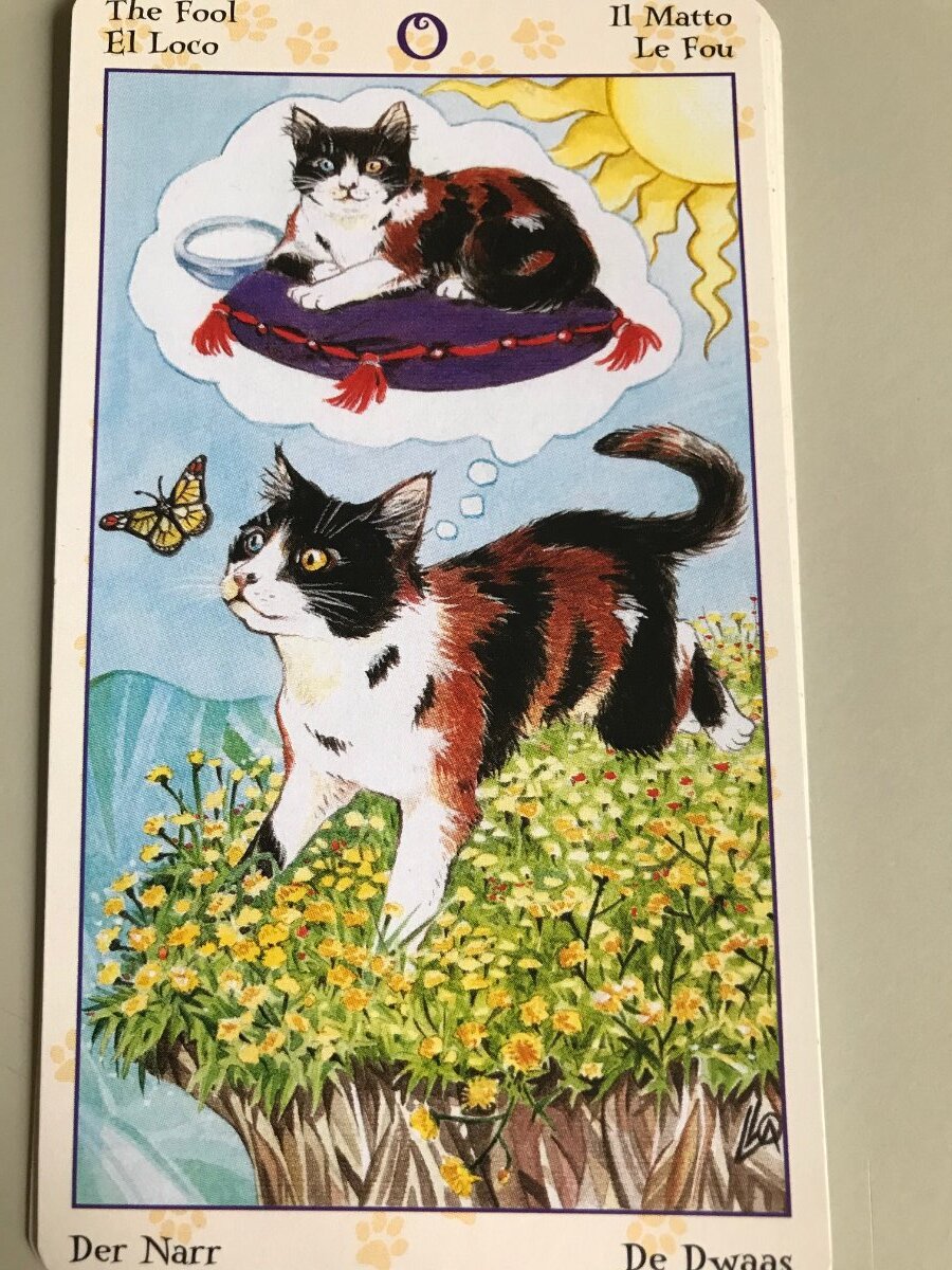 Lady Butterfly Posted October 5, 2020 Posted October 5, 2020 Right, here are my Fools. A little late, but whatever... Today, I will start with the Faery Wicca Tarot The Seeker Cuardaitheoir (koor-day-door) The Card Itself: Looking at this card, we see a multi-faced character. Every face seems to be looking down a separate pathway. He/They carry all their belongings in a sack on a stick. There appears to be a black feather blowing around in front of him. At his feet, there are several faery-folk who seem to be vying for his attention, or perhaps they are suggesting the right path for him to take. In the distance we see a stone ring, which I believe signifies one of the faery cities. There is a rock on the ground at one of the intersections, it has a marking on it, perhaps giving direction. There seems to be a sunset sky in the distance. From the LWB: The Amadan-Dhu, sacred fool of faery, has perhaps called to you. Time to visit the wilderness and reconnect with the soul of nature. A new journey is at hand, one that will guide you down the pathways of the Faery. A true initiation is at hand, but first you must enter the labyrinth of the mind and find your heart. All that you need in life you already carry with you. Let spirit guide you. Observations: Looking at this card gives me a feeling of confusion! I don't feel the naivety of the RWS Fool at all. This guy feels like he is being pulled into a million directions. It feels like everyone wants his attention and to make him do things their way. The bag he carries with him makes me feel like he is trying to make his own way in the world, but all these other influences are pulling him to go their way instead. This feels like peer pressure! Perhaps the message is, as the LWB says "You must enter the labyrinth of the mind and find your heart". Then, we move onto the Tarot of Pagan Cats. The Fool The Card Itself: We have a cat on the edge of a cliff, chasing a butterfly. He is thinking of a nice soft pillow and a bowl of milk. The sun is shining down on him and the cliff is covered in flowers. Beneath the cliff appears to be water. From the LWB: This is the moment before the first step is taken. You may have an idea of where you want to end up, but you have no idea how to get there. Reversed: Making a foolish choice. Observations: This is a sweet card. It reminds me of my very own familiar who is smart, yet easily distracted and disastrously clumsy! He manages to get himself into all manner of situations because he doesn't think it through, and often ends up stuck in/on, or falling off of things. This card gives me that 'look before you leap' feeling. Things may be exciting, and you may want to get going, but just take a moment to look a little more carefully at what you are doing. Yes, the goal is important, but how you get there matters too. In comparing the two cards, the journey undertaken by the Seeker of the Faery Wicca feels like a more serious endeavor. The Cat Fool seems more playful and excited. However, you can't help feeling that both could end up in peril.