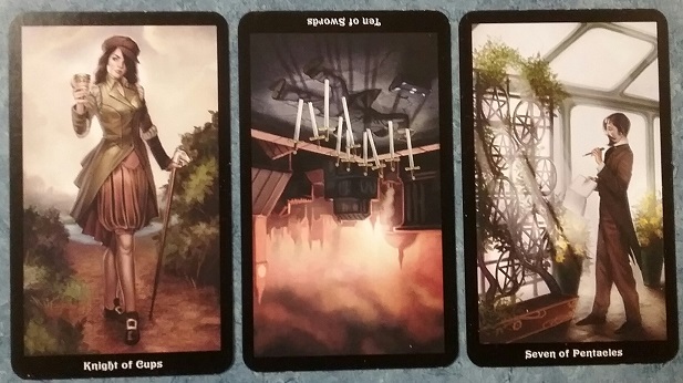 Trogon Posted August 28, 2017 Posted August 28, 2017 Because I've been training a new dispatcher, I haven't really been able to do my daily reading about my eating issues for a couple of weeks. Things were beginning to be difficult again. However, I am now back to being by myself and I was able to do my reading! As previously mentioned, I'm using Moore & Fell's Steampunk Tarot this week. One thing I really like about it is the very strong RWS influence in the images. If you're familiar with the RWS, you can immediately read with the Steampunk Tarot. That being said, Moore and Fell have definitely added their own flair to this deck. For one thing, 3 of the Knights are women - only the Knight of Pentacles is a man - and this gives a slightly different outlook on these cards. But even though the RWS influence is so strong, so is the steampunk feel. It's as if there was a smell of coal, steam and ozone along with the whir of the machinery and the crackle of energy in most of the images. I can't say for certain just how much influence the steampunk theme will have on interpreting the cards in the long-run, but I did feel it a bit in tonight's reading. Here are my notes (and see attached image); ~~~~~ 1) Issue - Knight of Cups; Emotions. Emotional eating is a problem for me. I often eat more when feeling "down" - which I have always had an issue with doing. here that Knight stands on a path leading to a lake. She appears somewhat stern, and is blocking the path - though not actively. My first thought/impression on seeing her was "emo". Depression & frustration are deep-seated issues for me on this topic. My eating habits are driven by emotion. 2) Blockage - 10 of Swords-rx; Continuing to struggle with the same issues. It often feels as though the same things come up in these readings - that I'm still struggling ... because I always am. I have been keeping away from sugar for some months, but I have to continue to work at this. It is like any addiction and I must continue the work. If I falter (as I have for a few days) my health will suffer and that sunset may come too soon. 3) To Contemplate - 7 of Pentacles; I have gotten a good start on eating better and getting healthier. Now comes the tending, the continuation and improving of the good habits that I have begun. If I want to reap the benefits of better health, I can not ignore the garden. This also may indicate a need to actually start keeping more of a record and actually planning what I eat, instead of just "winging it". ~~~~~ The Knight of Cups definitely had a different feel in this deck. Particularly with the initial thought of her being "emo" (that was the actual word that popped into my head). Though there is a determination in her face that I found interesting ... as though the depression I sensed was fairly well hidden from those who don't know her very well. Then there's the idea of her blocking the path to the lake - as if you will have to learn to deal with her before you can get to those waters. The other card I felt was altered by the theme of the deck was the 7 of Pentacles. In the RWS, the person tending the garden is simply standing there, leaning on the rake and passively watching. However, in this card, we have a man who is watching, yes, but he is also taking notes, analyzing the growth and fruiting of what he has planted. There is a more active watching, rather than just waiting. As for the 10 of Swords ... I felt there was an influence of the gloom in the air which brought it back to the Knight of Cups. And, without the finality of the upright card, it is a good reminder, along with that 7 of Pentacles, that this will be a long-term "project". All in all, a great deck and one I am going to really enjoy using this week.